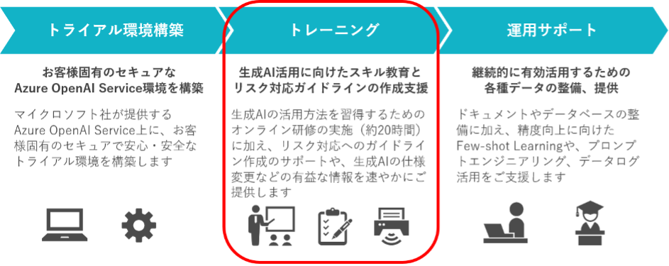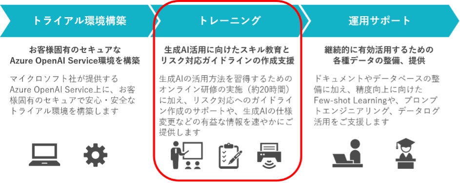 株式会社アグレックスが提供する「生成AI活用伴走支援サービス」は、マイクロソフト社のAzure OpenAI Service※1を用いた生成AIのトライアル環境構築からスキル教育、実務への活用支援まで、生成AIを安全かつ効果的に利用するための仕組み作りを伴走支援するサービスです。