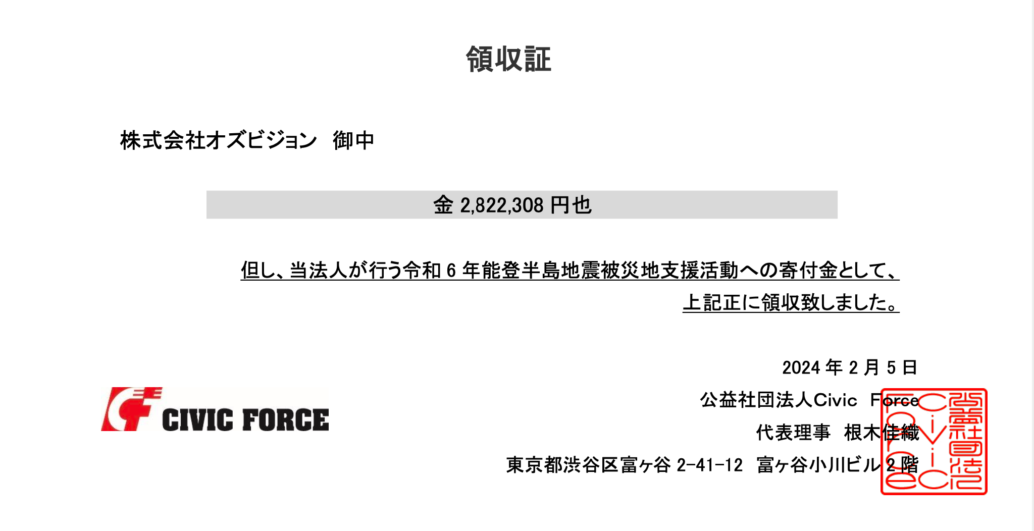 株式会社オズビジョン(本社:東京都渋谷区、代表取締役:鈴木 良)は、ポイントモール「ハピタス」 https://hapitas.jp/ において、1月4日から1月31日まで実施しておりましたハピタスポイント募金「能登半島地震ポイント募金」に関して、公益社団法人Civic Force https://www.civic-force.org/index.html に、2,822,308円の寄付を完了したことをお知らせいたします。