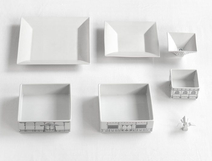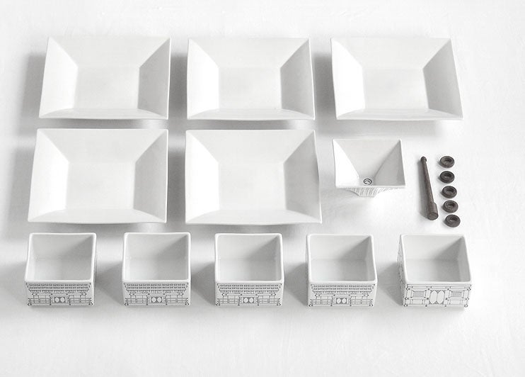 凛とした佇まいのKINKAKUと威風堂々とそびえたつGOJU。ただの置物ではありません。なんとこれは、歴史ある古都の伝統的な建物を磁器で再現したテーブルウェアセット。それぞれ展開すると、四角い部分は大小のお重に、屋根の部分は角皿や小鉢に、最上部もそれぞれ箸置きとして使えるようになっています。