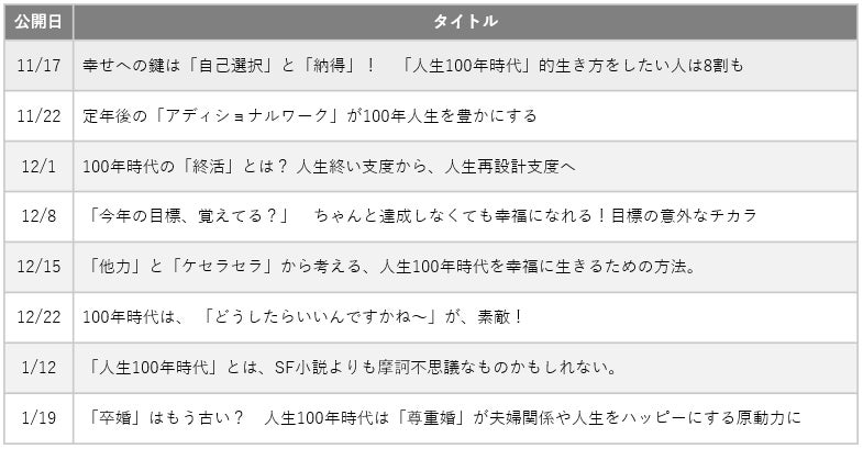 また、100年生活者研究所では毎週金曜日に、「人生100年時代」をテーマとしたニュースを配信しています。記事の詳細は下記URLにてご確認ください。