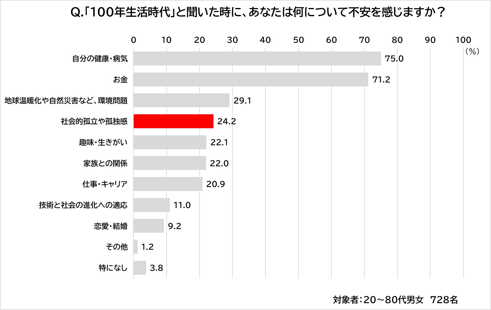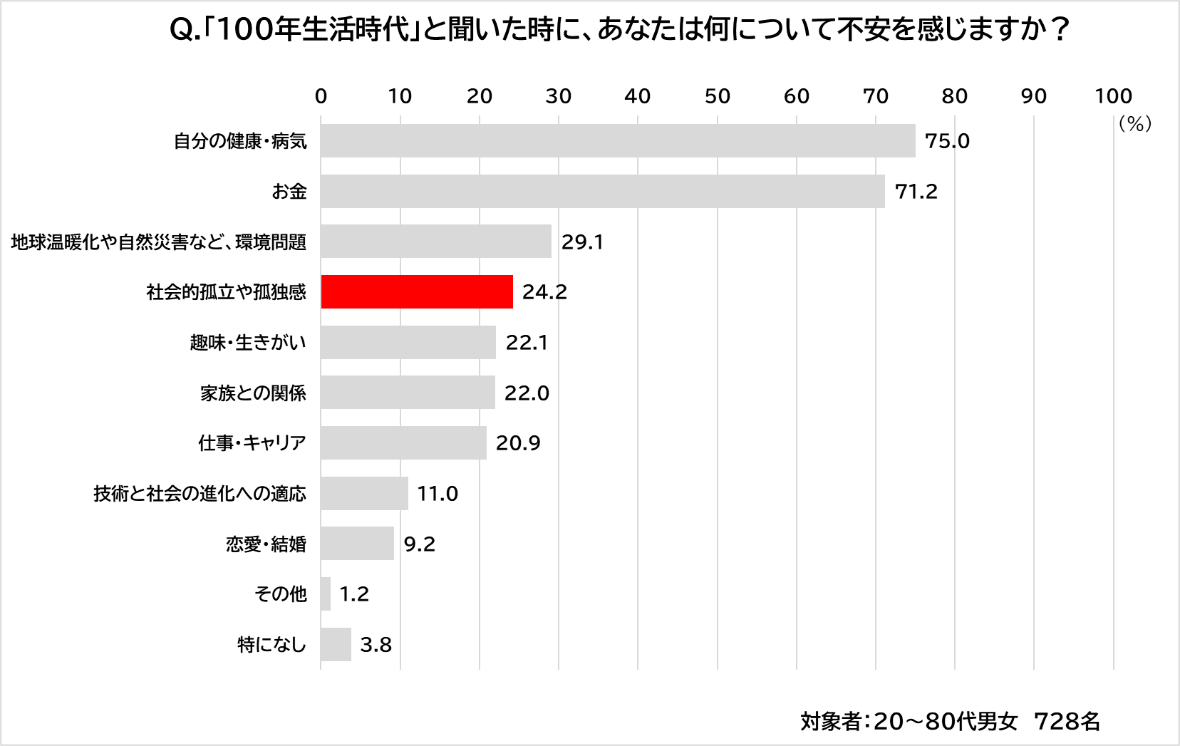1.「人生100年時代」の不安を聞いたところ、4人に1人が「社会的孤立や孤独感」を挙げた