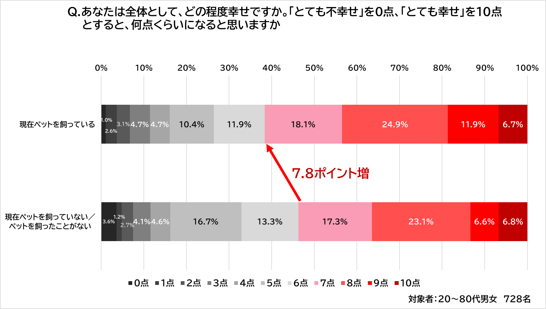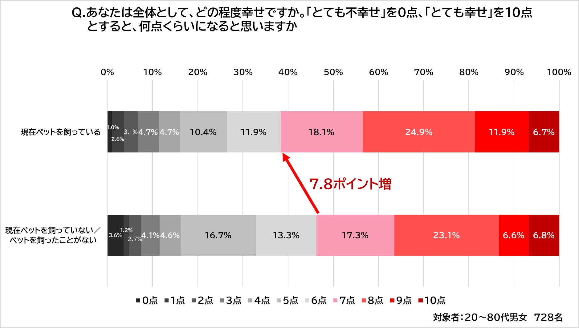 3.幸福度(10点満点)が7点以上である割合を調べたところ、ペットを飼っている人は、そうでない人より7.8ポイント高かった