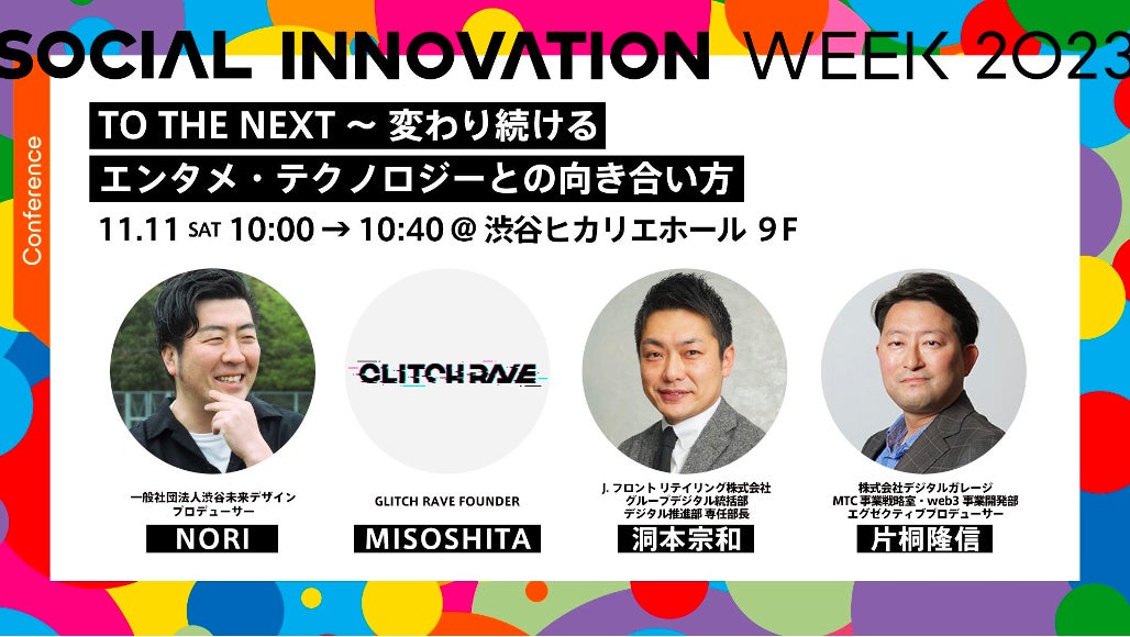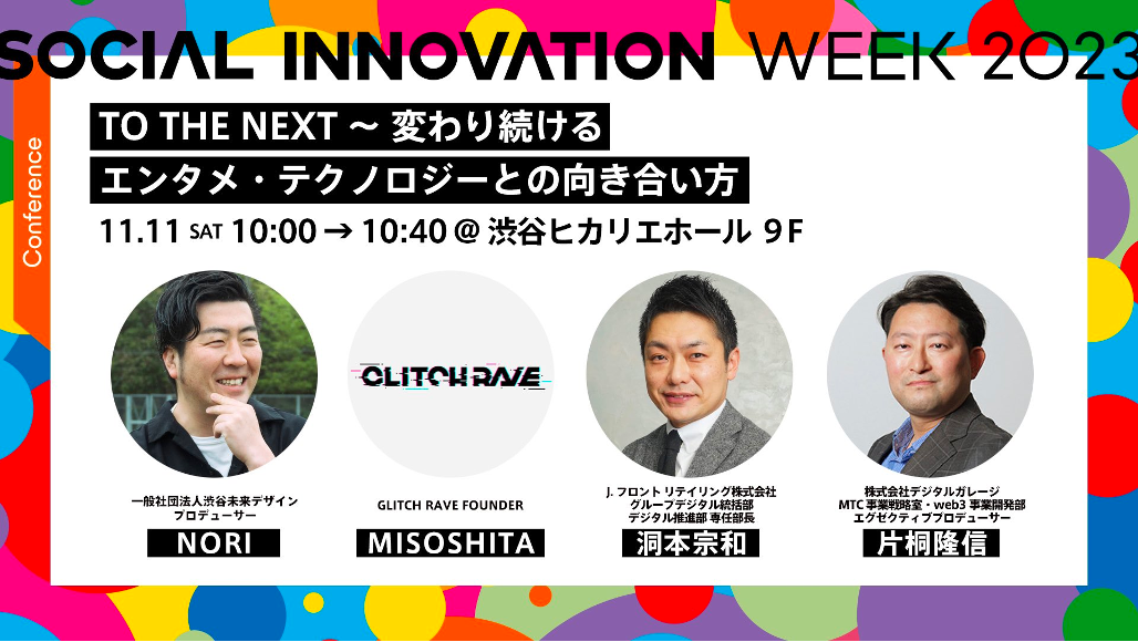 noriforce代表の中田宜明は次世代IPプロジェクト「GLITCH RAVE」プロジェクトのマーケティングを担当しています。SIW2023でGLITCH RAVEのブース出展をサポートするほか、Inter BEE 2023ではGLITCH RAVEのファウンダーであるMISOSHITA氏と共に登壇します。