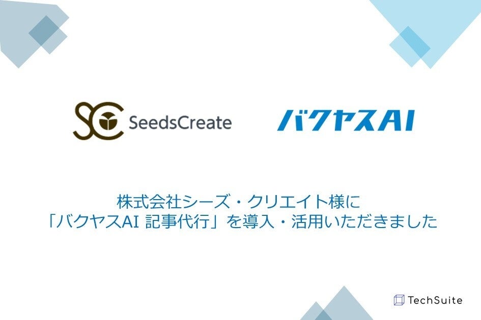 TechSuite株式会社(以下、「TechSuite」)は、千葉県柏市に拠点を置くWeb制作・マーケティング会社である株式会社シーズ・クリエイト様(以下、「シーズ・クリエイト」)に対し、2024年4月より弊社サービス「バクヤスAI 記事代行」を提供し、記事コンテンツの制作をご支援しております。