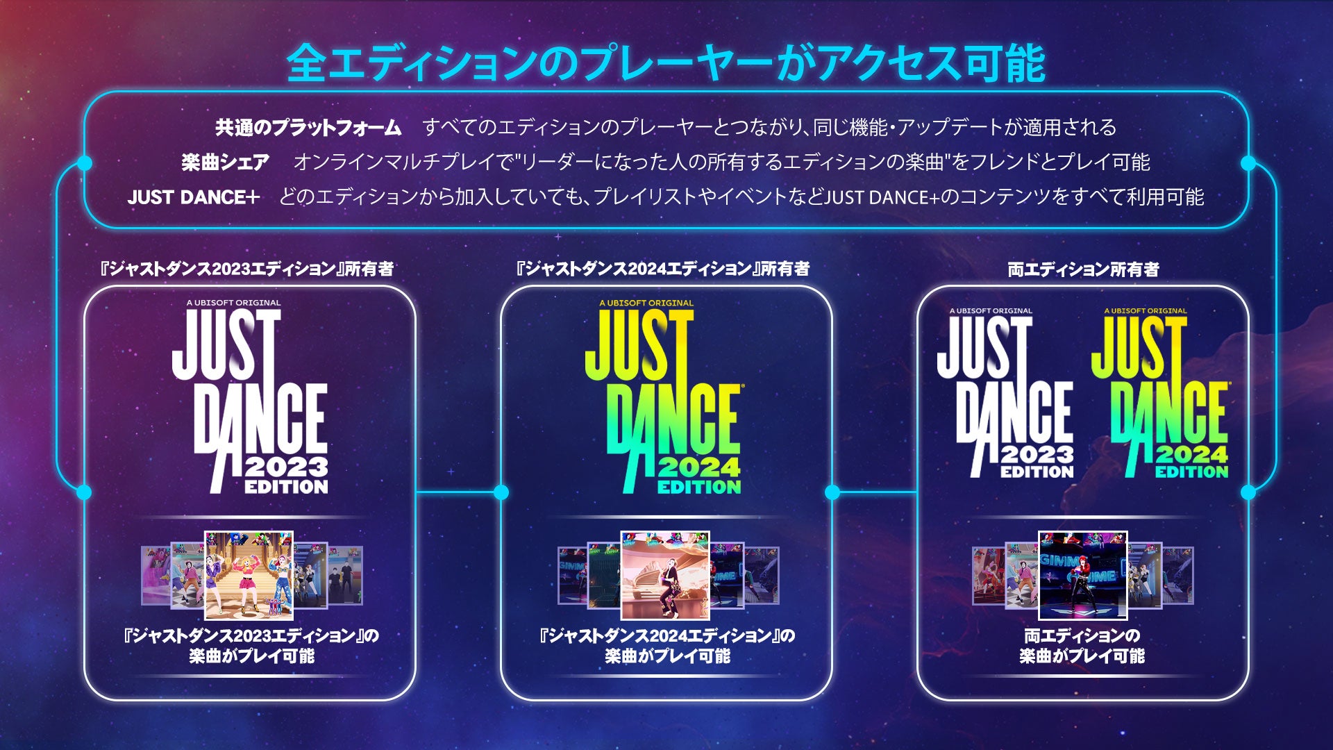 また『ジャストダンス2023エディション』(以下『2023エディション』)と『ジャストダンス2024エディション』(以下『2024エディション』)の両方を所有している場合、1つのゲーム上で単一の『ジャストダンス』として統合され、保有するすべての楽曲を従来以上に簡単にプレイしやすくなっています。『2024エディション』をお持ちの方は、『2023エディション』を所有するフレンドと一緒に、オンライン上にて『2024エディション』の楽曲をプレイすることができます。同様に、オンラインマルチプレイのリーダーを切り替えることで、『2023エディション』の楽曲を一緒にプレイすることも可能です。(※詳しくは画像を参照)『2023エディション』の楽曲に加え、新たに『2024エディション』に追加された40の新たな楽曲をお楽しみください。
