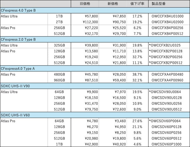 OWC Atlasメモリーカード19製品の価格改定を実施