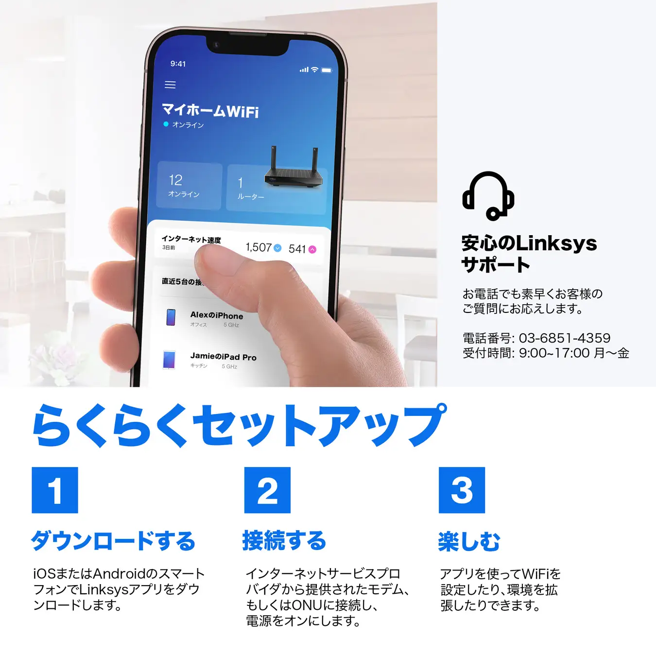 iPhoneとAndroidに対応したLinksysアプリを使えば、簡単にセットアップを完了できます。また、アプリを使って接続デバイスを確認したり、デバイス間の優先順位の設定など様々な調整も可能です。インターネットの接続等でご不明な点などがございましたら、もちろん日本語で対応可能ですので、下記Linksysサポートダイアルまでお問い合わせください。