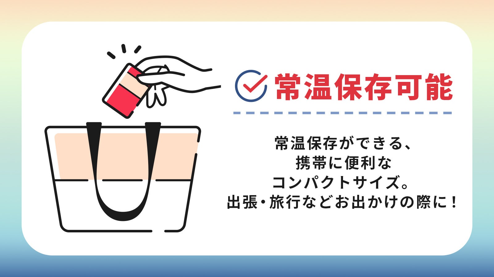 3)持ち運びに便利:常温保存でコンパクトなサイズ。職場や旅行先へも携帯ができ、どこでも手軽に摂取が可能。