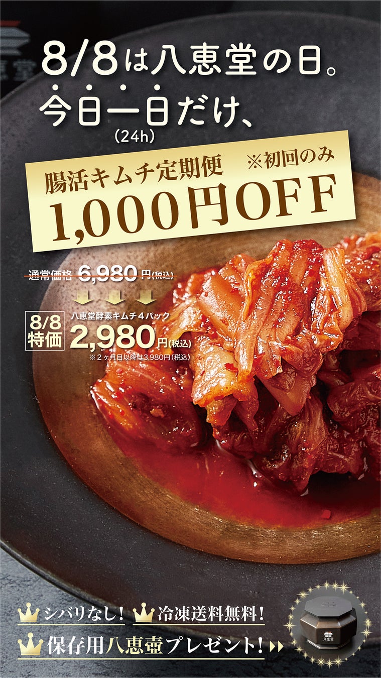 8月8日は博多生まれの酵素キムチ、八恵堂が制定する「八恵堂の日」。これを記念致しまして、8月8日限定のゲリラキャンペーンを行います。