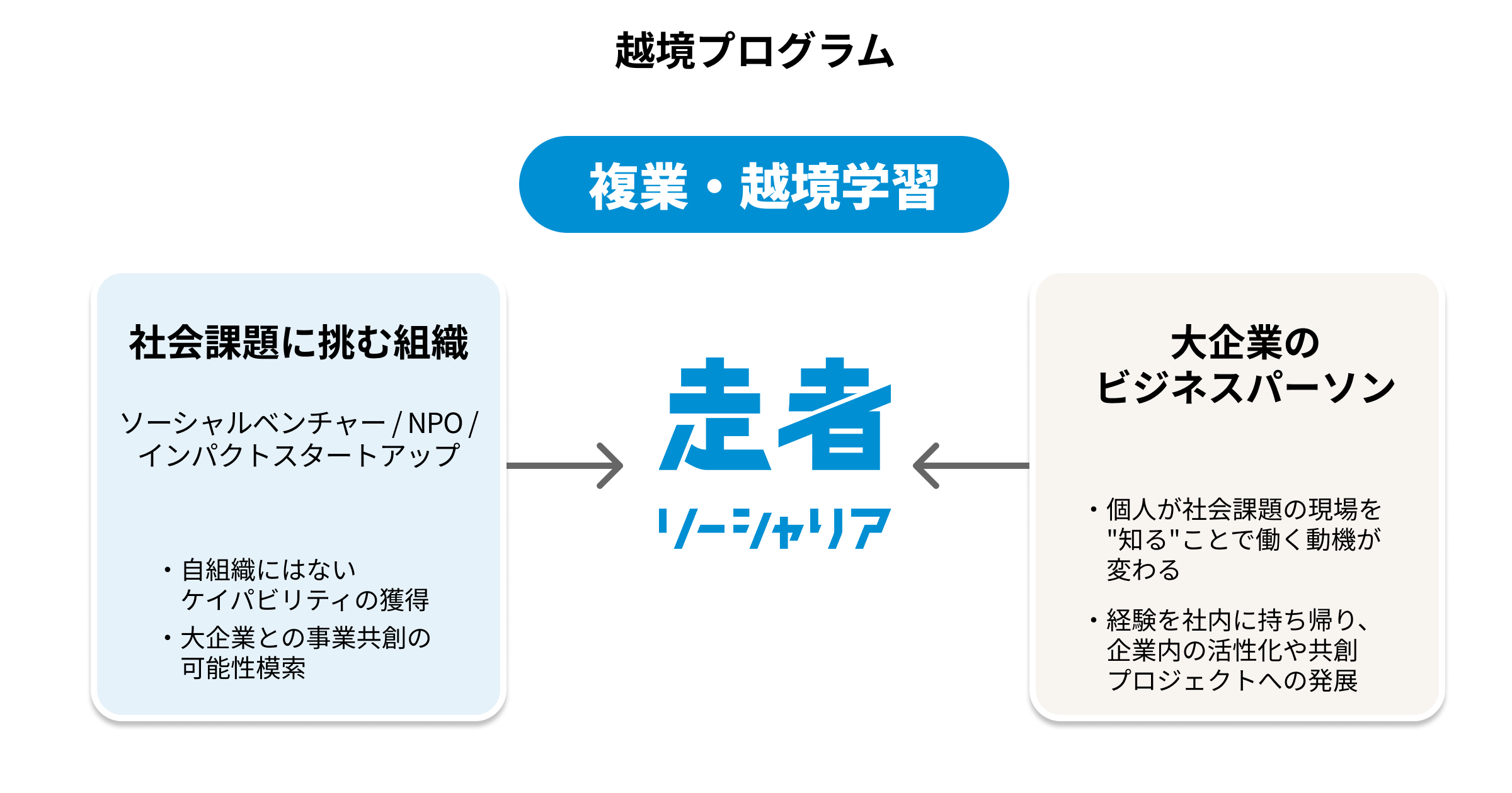 「越境プログラム」は、大企業のビジネスパーソンがソーシャルベンチャー・NPOやインパクトスタートアップといった社会課題に挑む組織の現場に、複業・越境学習という形で段階的に関わることを支援する構想です。