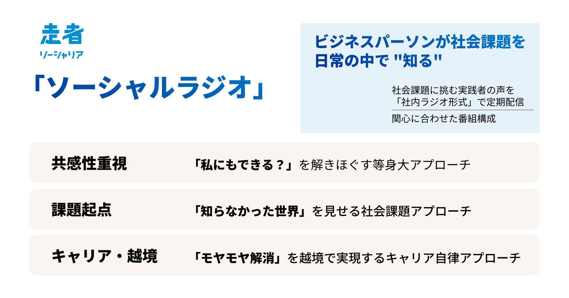 「ソーシャルラジオ」は、大企業のビジネスパーソンと社会課題の現場をつなぐ「越境プログラム」構想の一つです。社会課題に挑む実践者の声を社内ラジオ形式で定期配信することで、ビジネスパーソンが社会課題を日常の中で「知る」機会を提供します。
