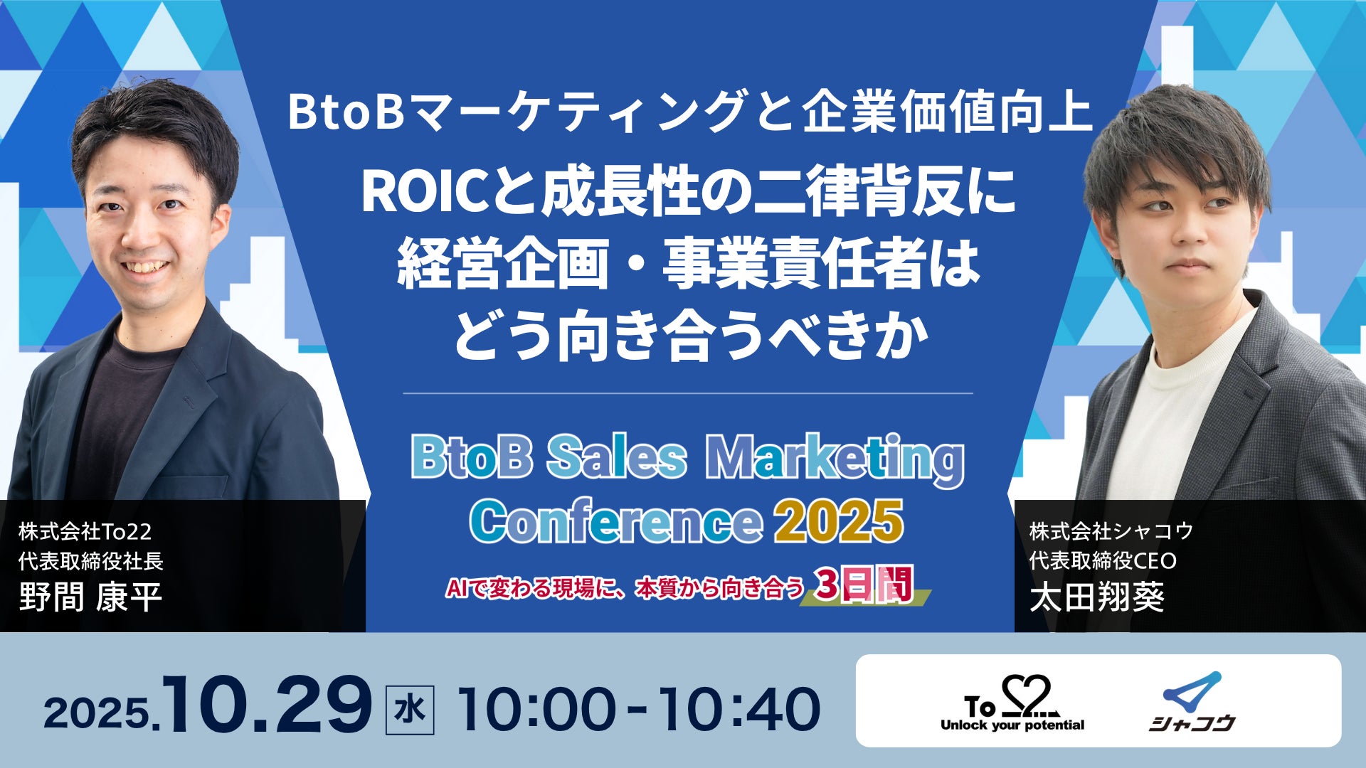 To22の野間様をお呼び、弊社シャコウとともに、企業価値向上に向けたBtoBマーケティングが果たす役割とROICと成長性への向き合い方を語ります。