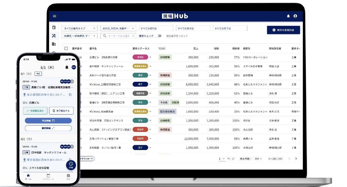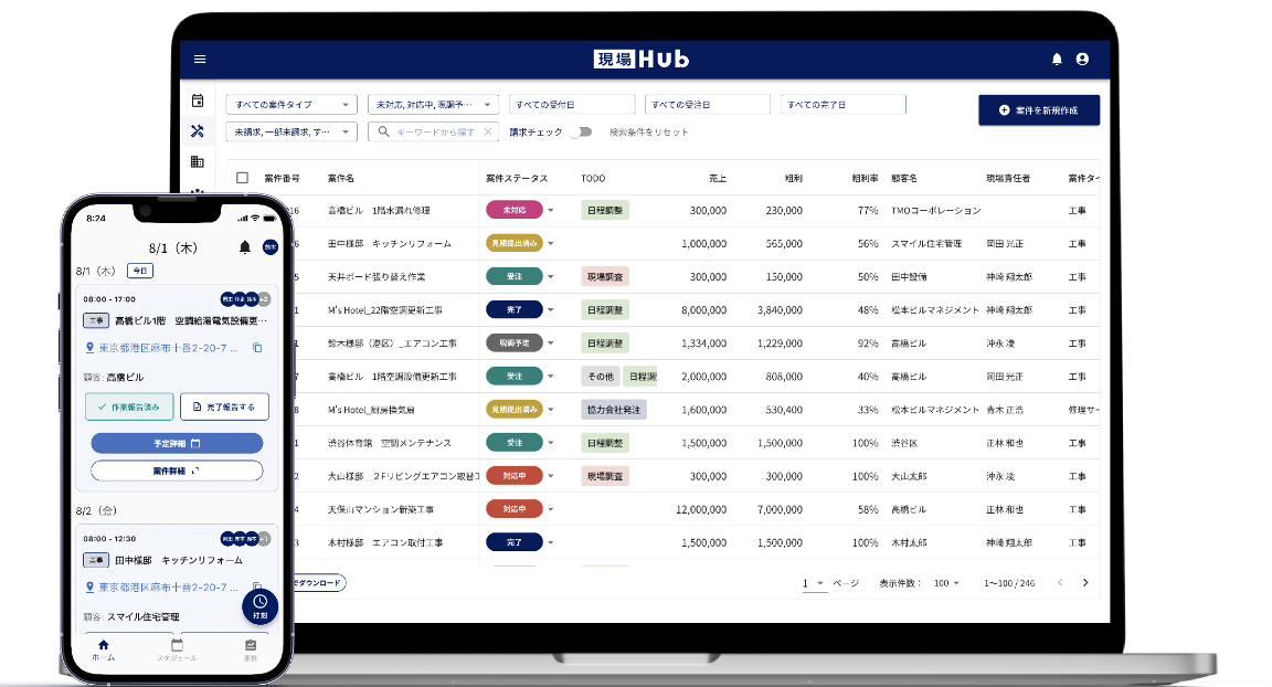 こうした環境変化の中、「業務全体の標準化による属人化の解消」と「品質を維持したまま事業を拡大できる基盤づくり」が重要な経営課題となっています。現場Hubは、案件管理・予定・報告書・請求など、あらゆる情報を一元管理することで、業務効率化を実現します。