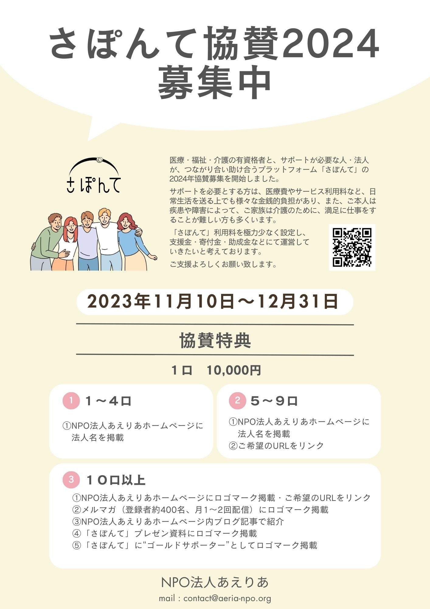 『さぽんて』利用料を極力少なく設定し、協賛金・寄付金・助成金などにて運営していきたいと考えております。