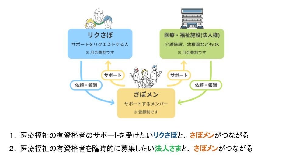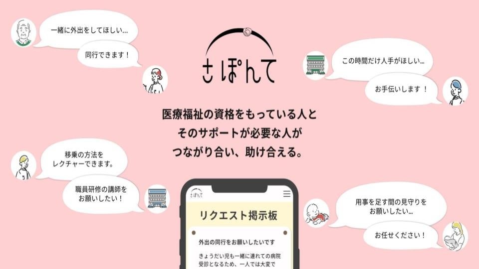 この社会課題を解決するべく、NPO法人あえりあが2021年7月に札幌市でβ版をリリースしたのが、医療・福祉・介護の有資格者と、サポートが必要な人が、つながり合い助け合うプラットフォーム「さぽんて」です。