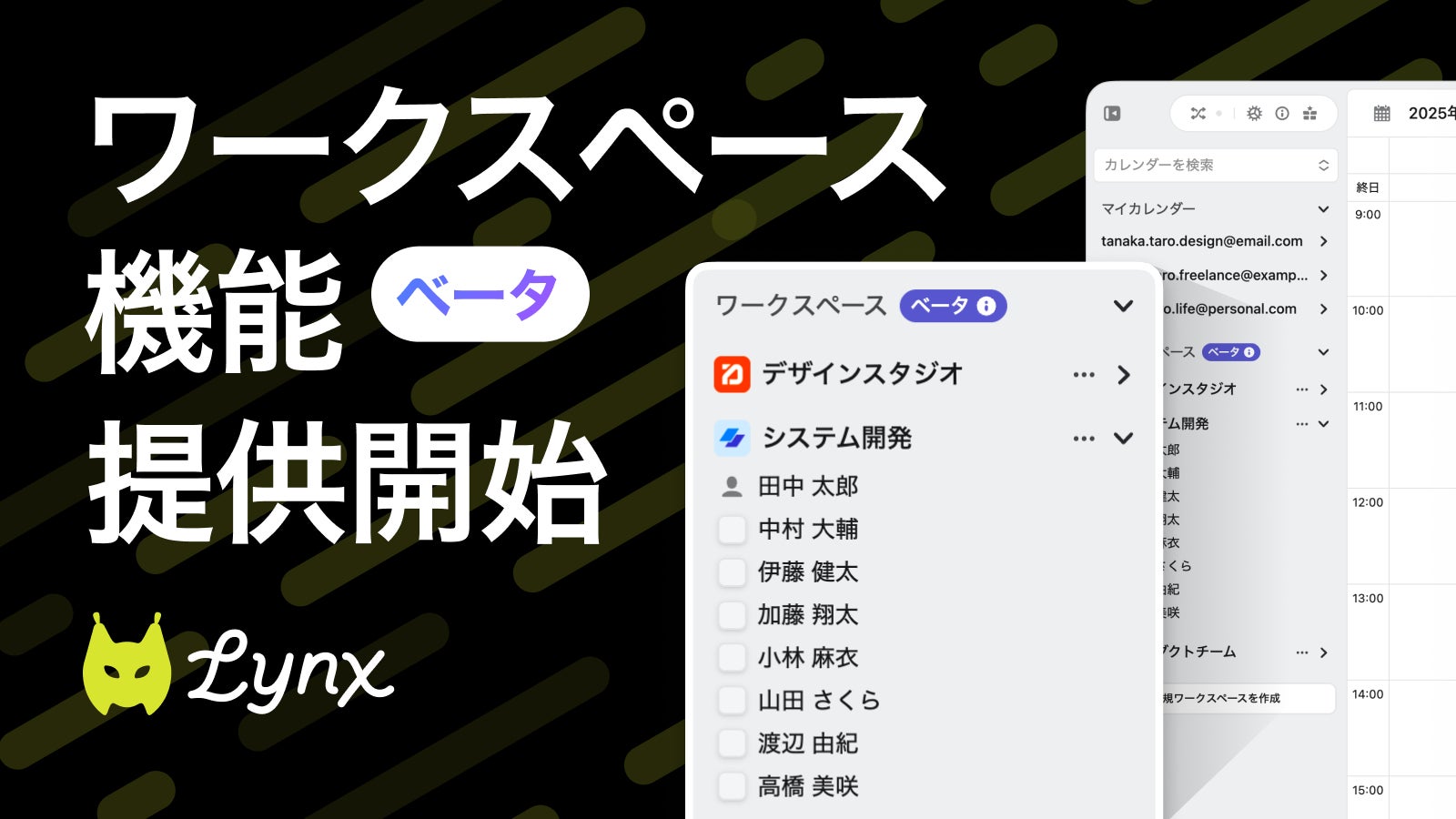 株式会社タイムラボ(本社:大阪府大阪市、代表取締役CEO:保積雄介、以下「タイムラボ」)は、複数のカレンダーをまとめて自動同期できるカレンダーアプリ「Lynx」(読み方:リンクス)の新機能であるワークスペース機能のβ版を、2025年12月11日(木)に提供を開始したことをお知らせいたします。