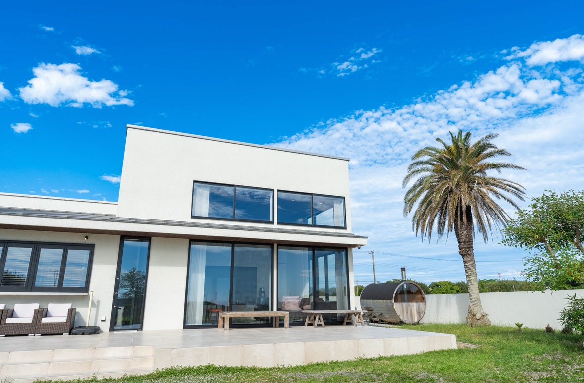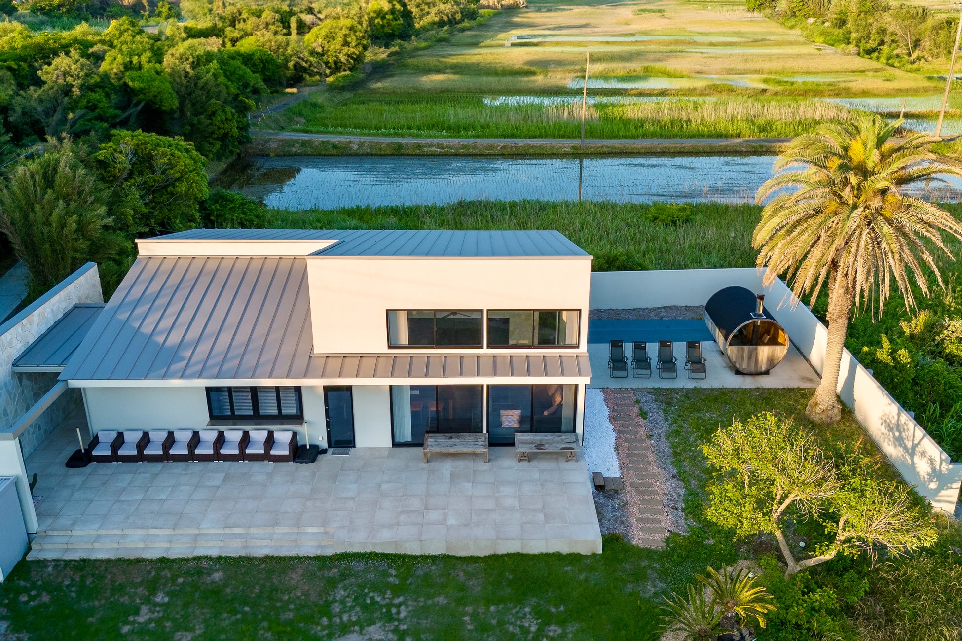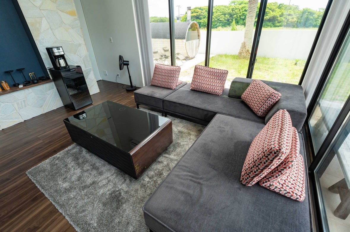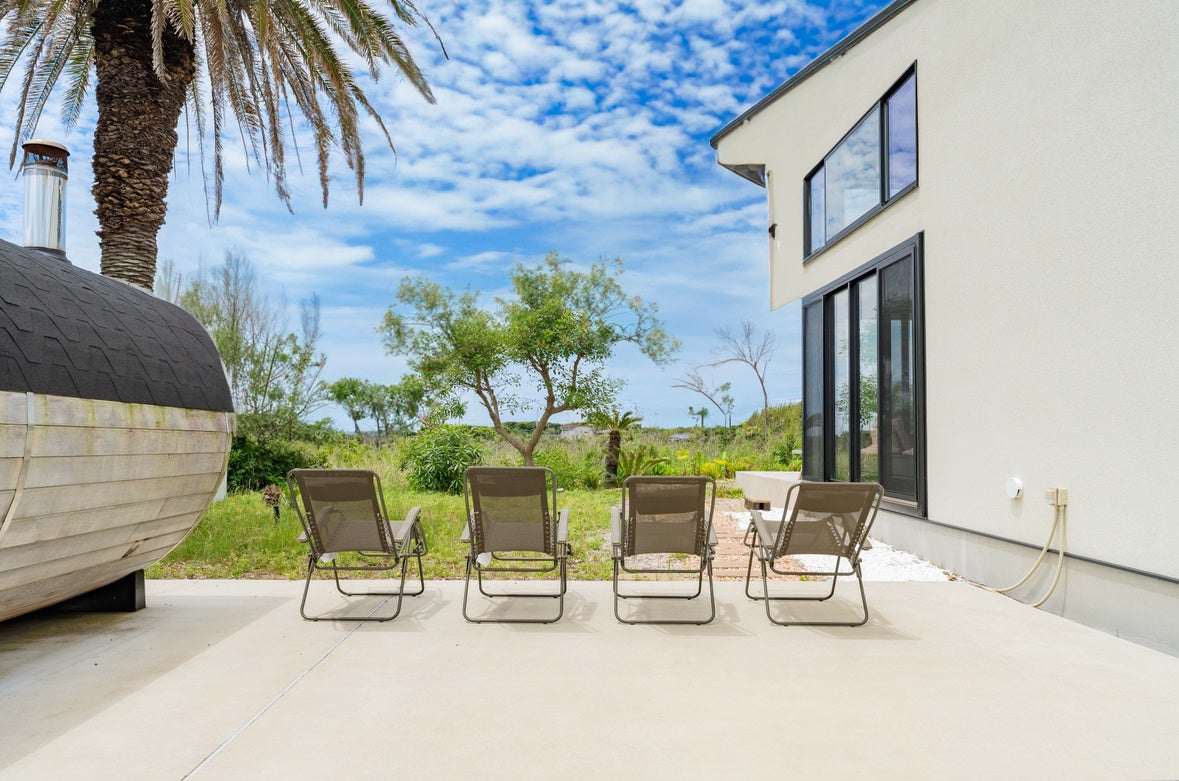 本施設は、自然豊かな南房総エリアの中でもとりわけ穏やかな時間が流れる「洲宮」に位置し、広々とした中庭を中心に、薪ストーブ式の本格バレルサウナや、愛犬と過ごせる専用ドッグランを備えた、1日1組限定の完全プライベートヴィラです。