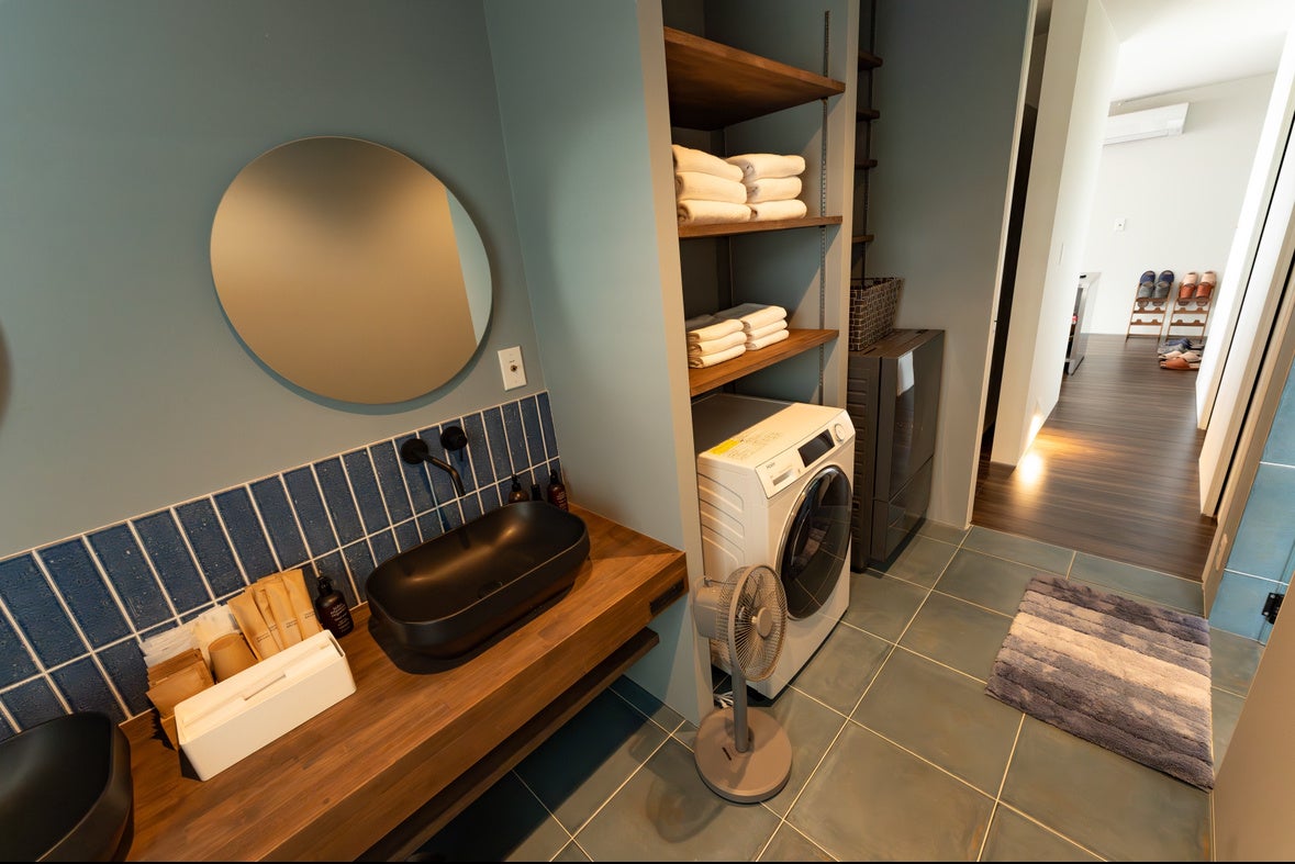 木の温もりとスタイリッシュなデザインが調和した、洗練された洗面エリア。ダブルボウルの洗面台に加え、タオルやアメニティ類も豊富にご用意。洗濯機・乾燥機も完備されており、長期滞在やファミリーでのご利用にも快適な空間です。
