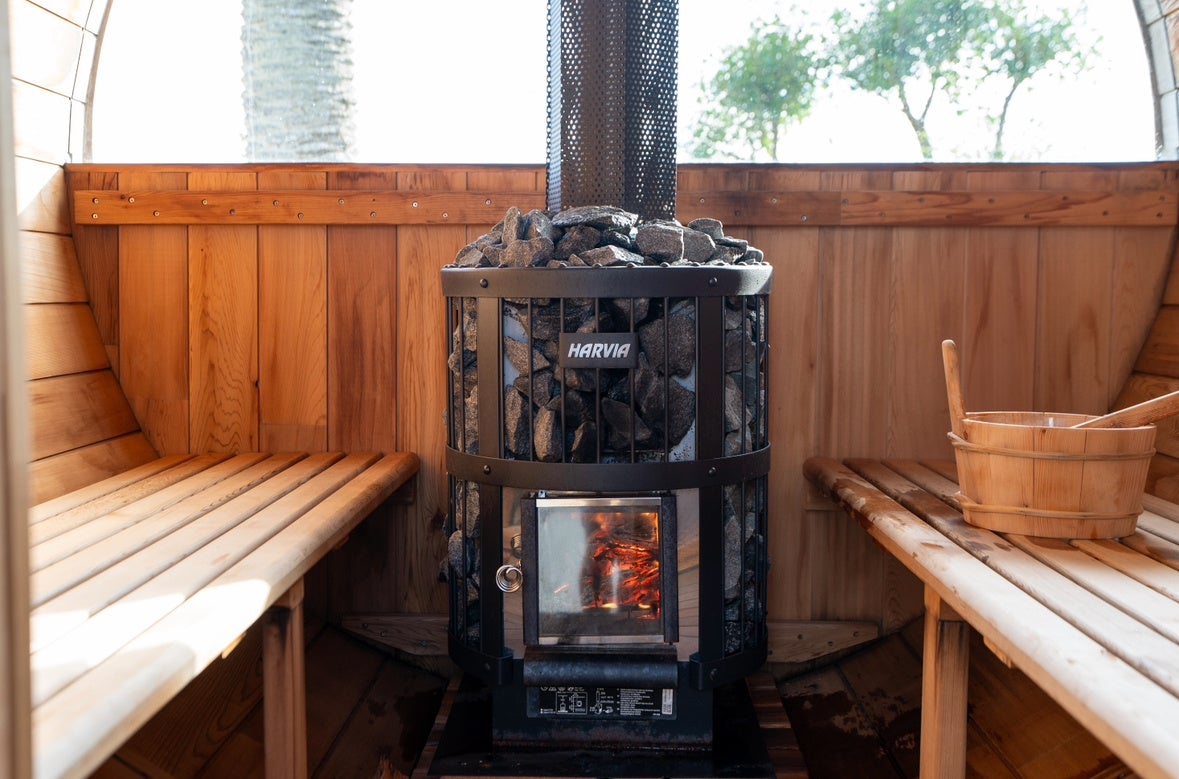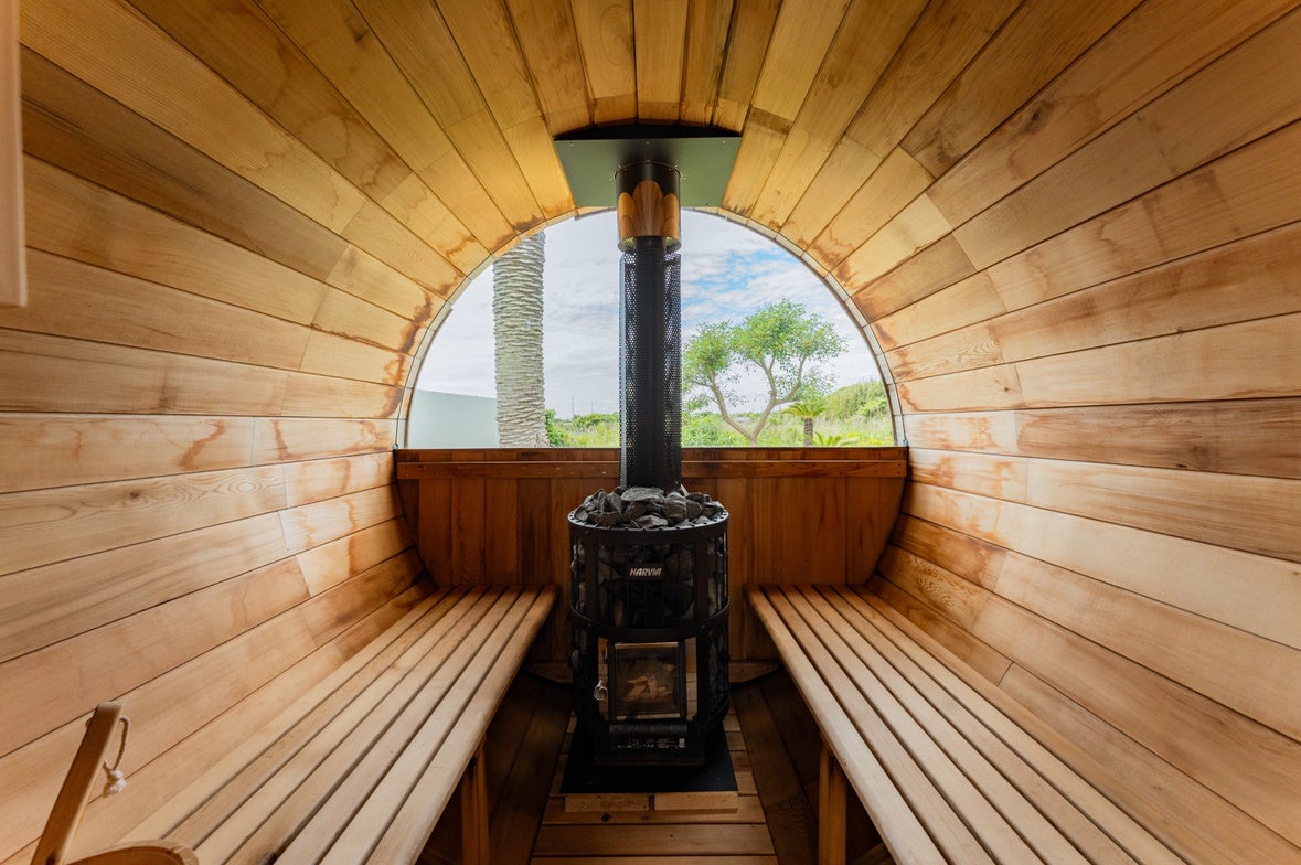 薪式のバレルサウナとリクライニングチェアを完備。青空と緑に囲まれた開放的な空間で、五感を解き放つ“ととのい体験”をお楽しみいただけます。