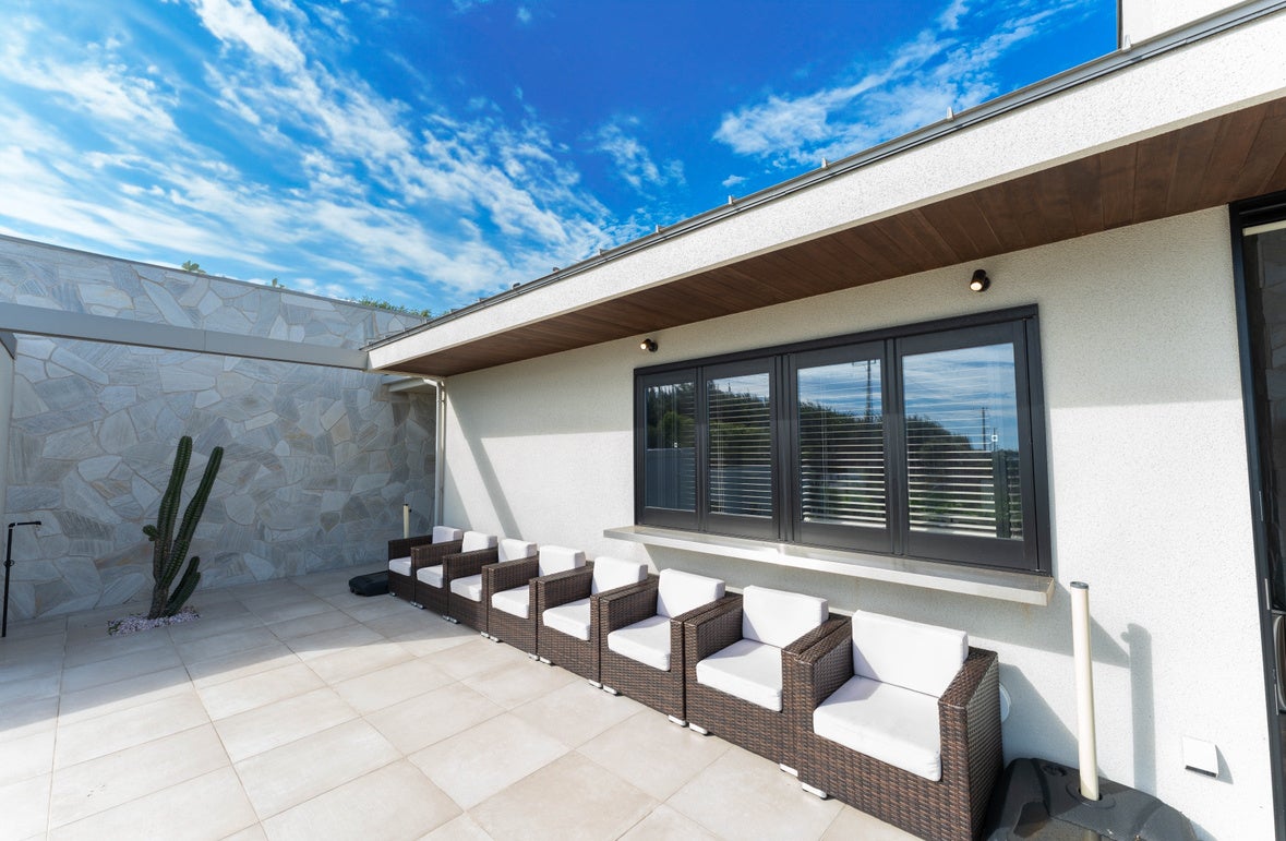 屋外家具を配置した中庭は、青空の下でゆったりと過ごせる開放的な空間。柔らかな日差しが差し込む昼下がりには、読書やティータイムにも最適です。周囲は高い壁に囲まれており、外からの視線を気にせず、プライベートなひとときをお楽しみいただけます。