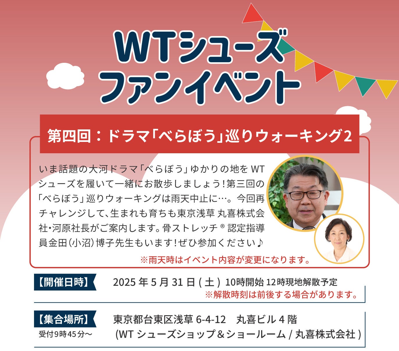 内容:今回は話題の大河ドラマ「べらぼう」ゆかりの地をWTシューズを履いて一緒にお散歩。生まれも育ちも東京浅草、WTシューズの企画製造している靴メーカー丸喜株式会社の河原®勢朗社長が皆様をご案内します。当日は金田博子先生(骨ストレッチ認定指導員)もいらっしゃいます。