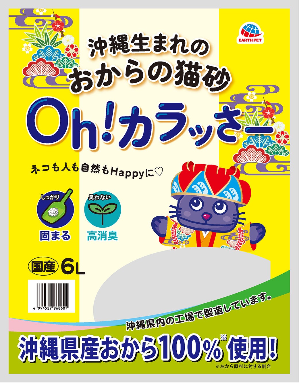 「沖縄工場」では「おからの猫砂Oh!カラッさー」を製造し、2024年10月1日(火)に上市し、沖縄県限定で販売します。愛猫オーナーは愛猫のトイレに「安心・安全であること」を重視しており*4、食品原料であるおからを使用した「Oh!カラッさー」は、愛猫へ安心してお使いいただける製品です。また、愛猫の排尿時にも、「Oh!カラッさー」はしっかり固まってニオイもケアするので、愛猫オーナーも安心して快適に過ごすことができます。
