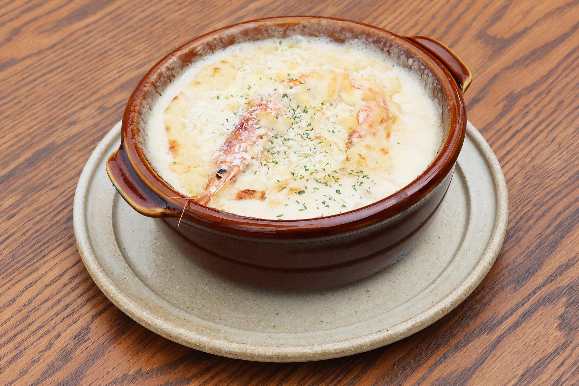 エビの旨味と風味をしっかりと感じられるホワイトソースをふんだんに使い、有頭海老とむき海老、バターライスが絶妙にマッチしたエビドリア。TIMEのベテランシェフが十数年働いたイタリア料理店の人気商品をアレンジしたシェフ自慢の一品です。