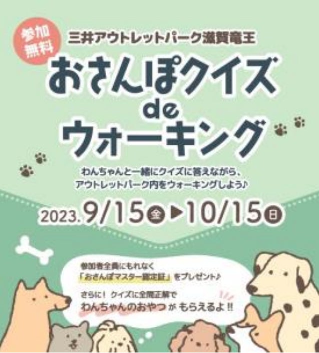三井アウトレットパーク 滋賀竜王では、ドッグランOPEN1周年を記念して、愛犬家のお客さまとわんちゃんが一緒に、身体を動かしてお楽しみいただける企画を実施します。