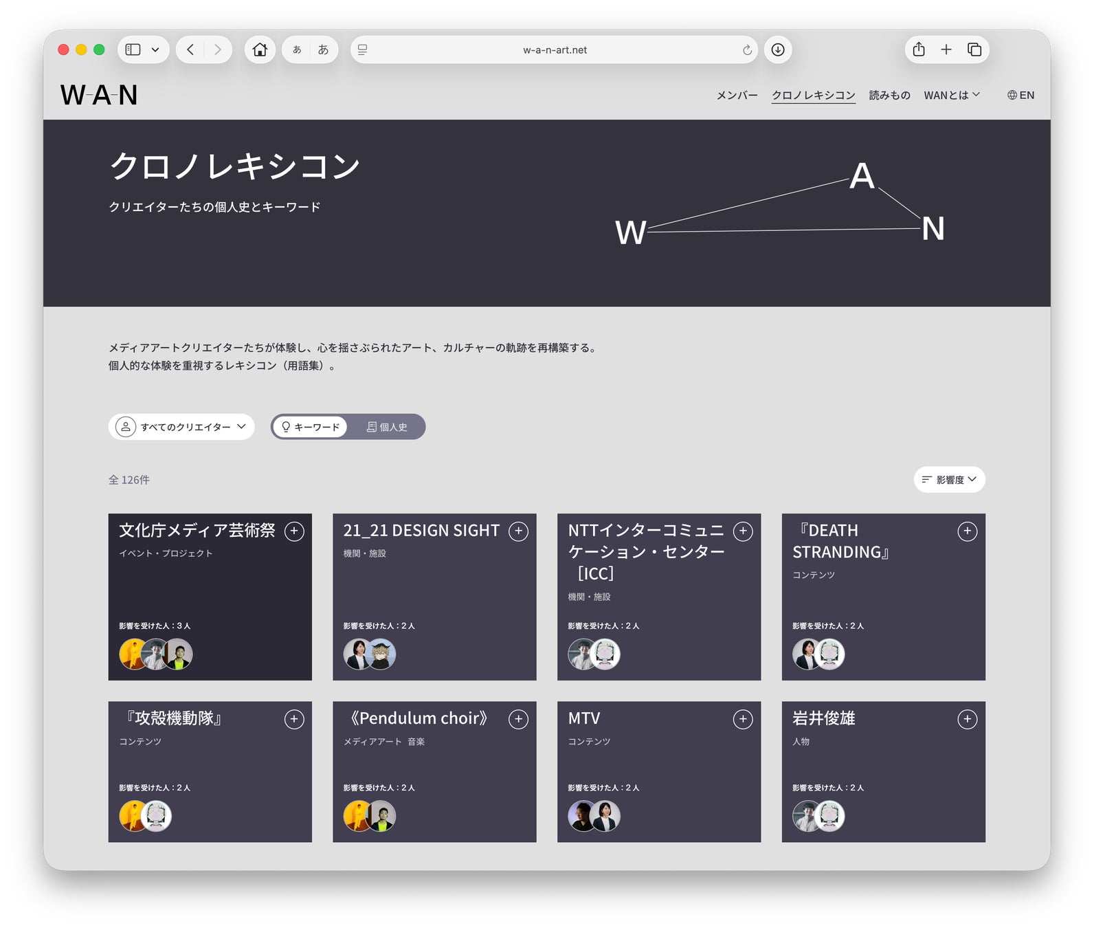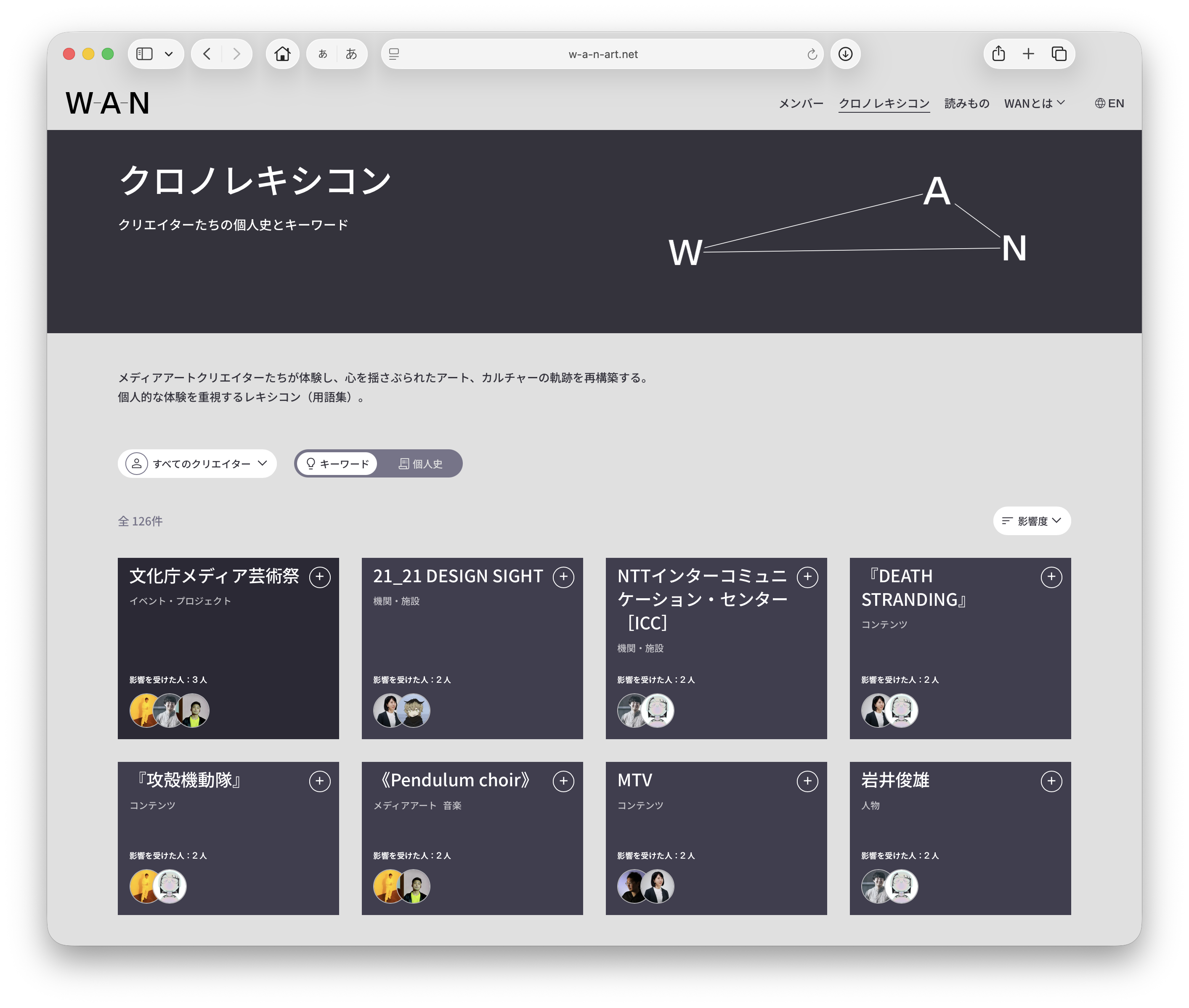 クロノレキシコンは、WANに採択されたメディアアートクリエイターたちが、これまでの人生で何から影響を受けてきたかという個人史(年表:クロノロジー)と、それらの用語を解説した語彙集(レキシコン)からなる新しい形のデータベースです。