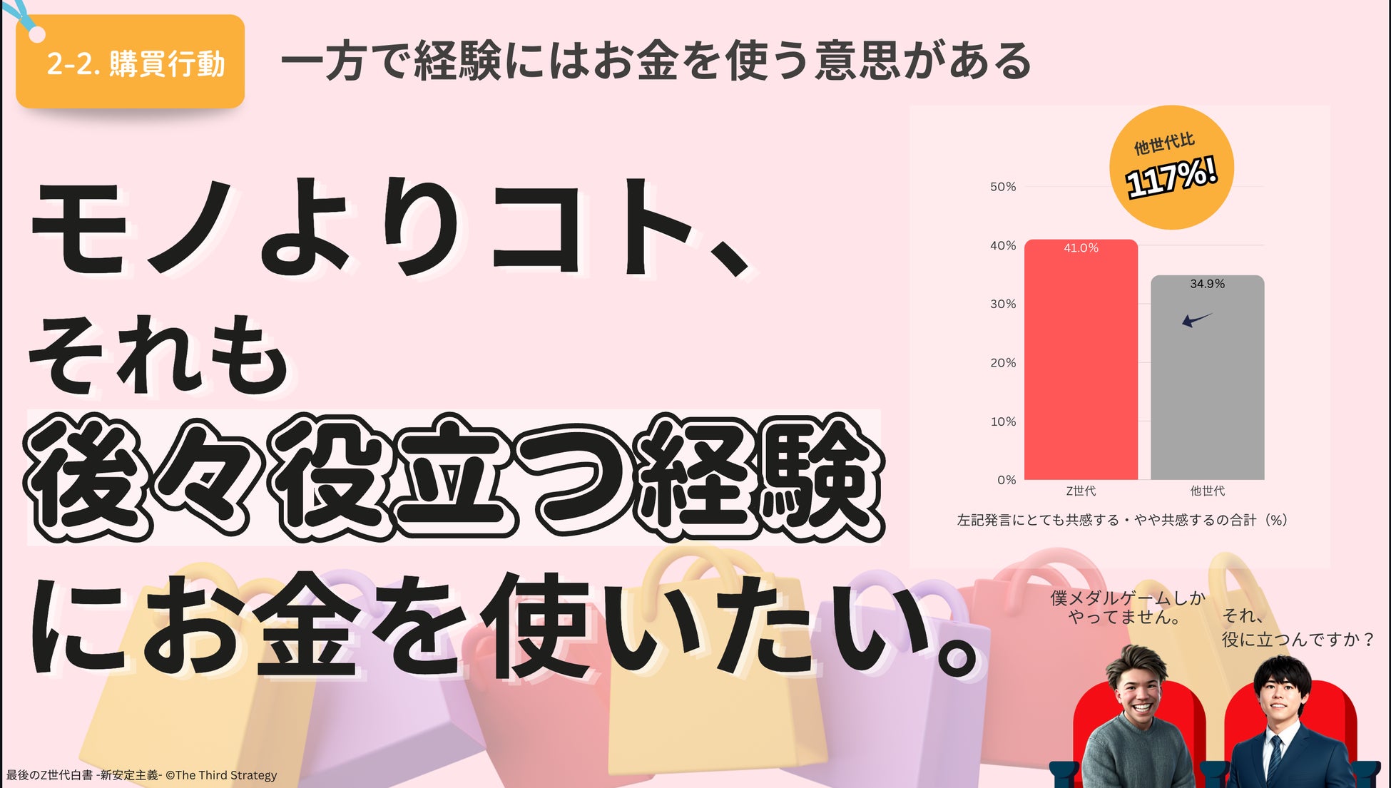 Z世代にとって「あとで後悔しないか」が消費の価値基準となっています。また、消費傾向はモノよりコト、それも後々役に立つ経験にお金を使いたいという意見に」多くのZ世代が共感しています。