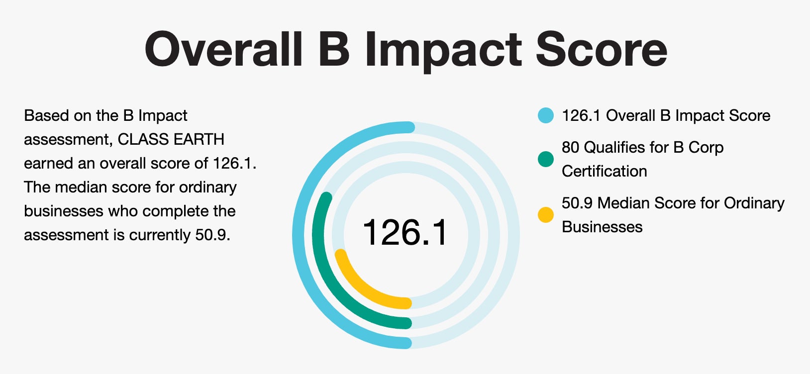 私たちは認証に至るまでの1年以上の期間の中で、自社の社会的および環境的インパクトについて見直し、どのような視点が必要なのかを明確にしながら改善を進めていきました。その結果、認証取得の条件となる「80点(200点満点)」に対し、「126.1点」を取得しました。一般企業の中央値は50.9点(Median Score for Ordinary Businesses)とされています。