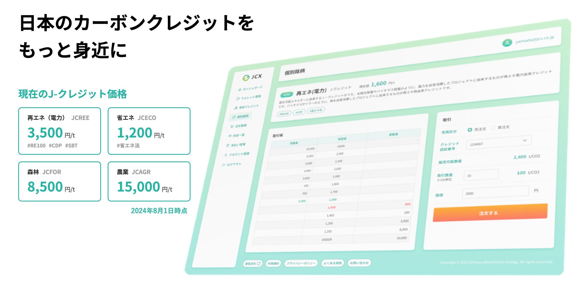 当社ではJCXにとどまらず、大手企業様がグリーントランスフォーメーション(GX)を推進するためのプロダクトを数多くローンチしてまいりました。この度調達した資金は、取引所をはじめとしたプロダクトの追加開発および社内組織体制の強化にあてる予定です。今後は日本のカーボンクレジット市場の拡大に向けて全国各地でクレジット創出プロジェクトの立ち上げ、ならびにネイチャーポジティブの取り組み推進に取り組んで参ります。