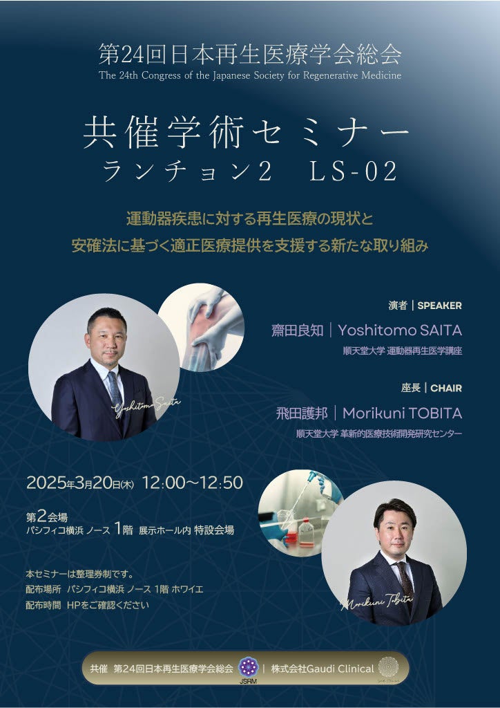 株式会社Gaudi Clinical(東京都文京区、代表:飛田護邦、以下 弊社)は、2025年3月20日(木)~3月22日(土)にパシフィコ横浜で開催される「第24回日本再生医療学会総会(以下 本総会)」において、共催学術セミナー、ポスター発表、シンポジウムに参加し、再生医療の発展に向けた最新の取り組みを発表いたします。