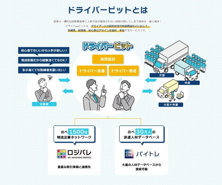 「ドライバーピット」は、従来の一律的なドライバー経験者採用では人材不足が解消されない企業に対して、ドライバーの雇用状況を踏まえ、案件や取り扱い商材に応じたスキルを持つドライバーを紹介・派遣するサービスです。また、未経験者や初⼼者を育成し、定着のフォローアップまで⼀貫して⾏うことで、ドライバー⼈材の需要に応えていきます。