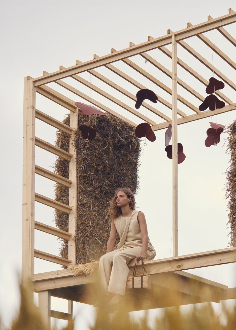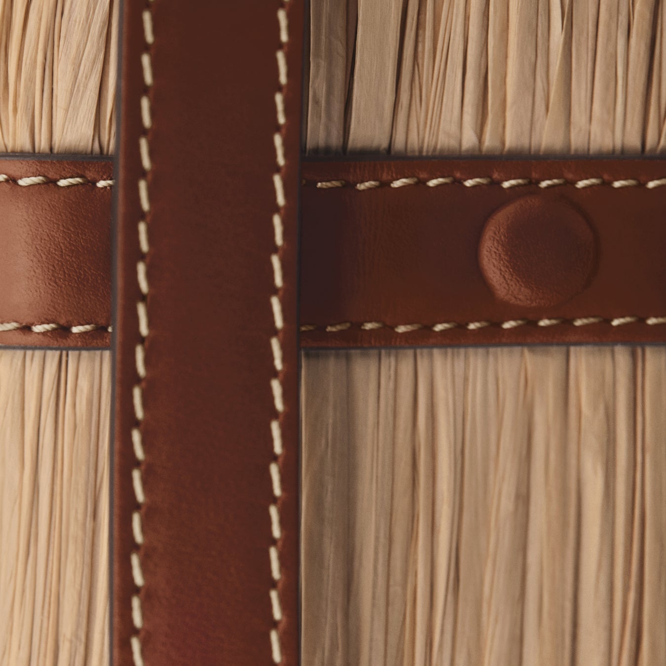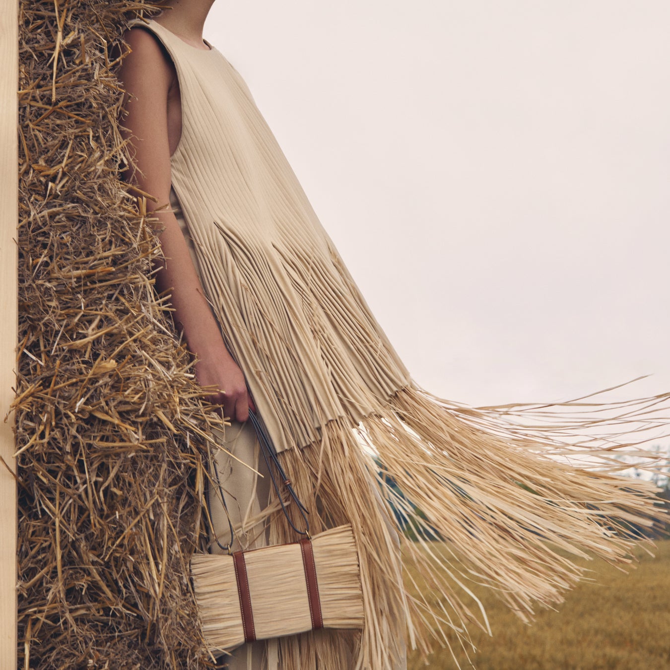 第1弾となるこのモデルは、天然ラフィアを使用し、わらの束をそのままバッグにしたかのような幻想的なデザイン。野原の麦わらから直接インスピレーションを得ています。100%天然のオーガニック認証を受けたラフィア素材をコニャックのレザーストラップ2本で束ねたものに、ダブルのショルダーストラップが付いた姿は、麦わらの束そのもののような錯覚を起こさせます。