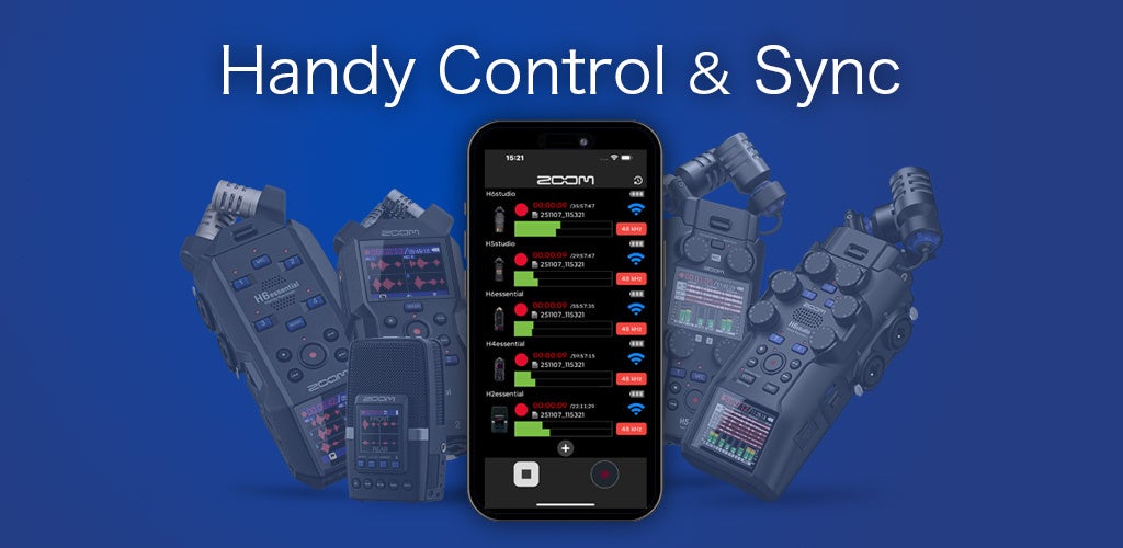 さらに、『H4essential』と『H6essential』は、複数のハンディレコーダー*を一括してリモート操作できるiOSアプリ「ZOOM Handy Control & Sync」に対応。iPhone/iPadから、録音の開始や停止、タイムコード同期、日時設定などの操作が行え、最大10台のハンディレコーダーを連携させたレコーディングが可能になります。