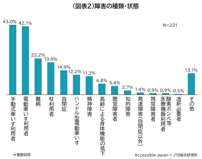 その他の回答者の内訳としては、難病(22.2%)、杖利用者(19.9%)、自閉症(14.9%)などが続きました。この結果は、アクセシブル・ツーリズムが幅広い障害や状況に対応する必要があることを示しています(図表2)。