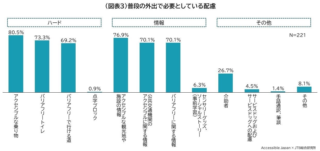 普段の外出で配慮が必要とされたものは、「アクセシブルな乗り物」80.5%、「アクセシブルな観光地や施設の情報」76.9%、「バリアフリートイレ」73.3%でした。アクセシブルな乗り物やバリアフリートイレなどの物理的なハード面の配慮だけでなく、アクセシブルな情報のニーズも高いことが分かりました。また、センサリーグッズやソーシャルストーリーなど、目に見えない障害をお持ちの方への配慮も求められています。これらは日常生活や旅行時に必要な基本的な配慮です。こうしたニーズに応え、適切に情報発信することで、訪日旅行の促進につながると考えられます(図表3)。
