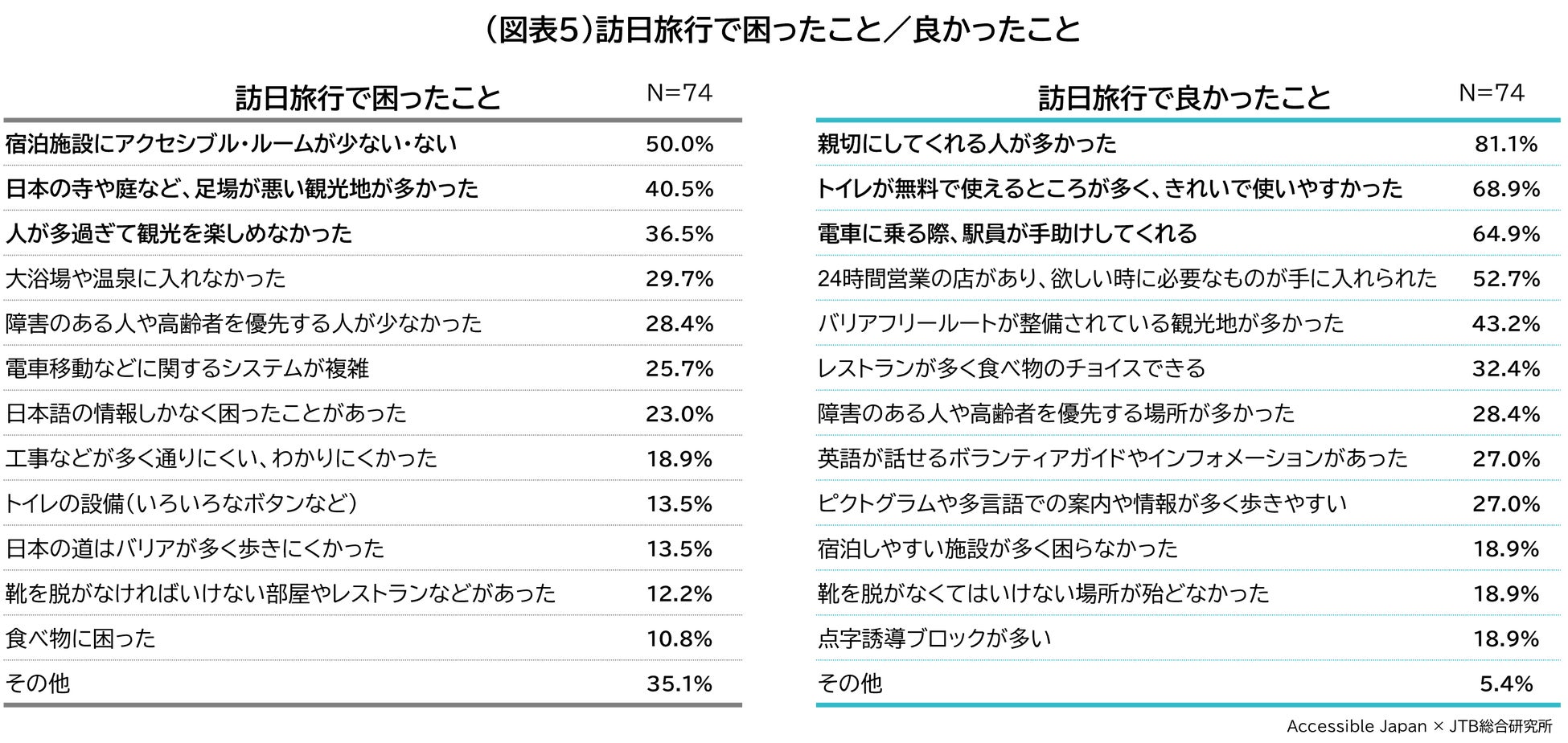 一方、良かったこととしては、親切にしてくれる人が多いことやトイレが無料で使えることが高く評価されており、日本のおもてなしの文化が障害を持つ人々にも好印象を与えていることが明らかになりました。また、「電車での移動時に駅員が手助けしてくれる」との回答も多く、日本の公共交通機関におけるサポートが評価されていることが分かります(図表5)。