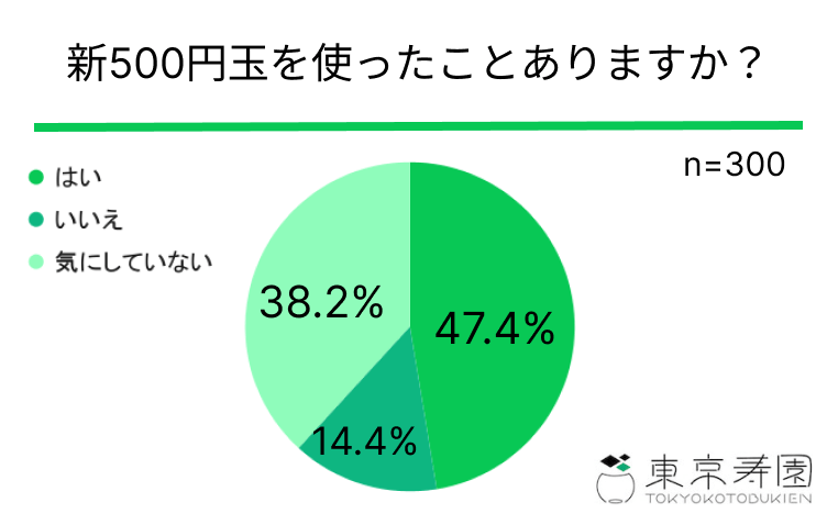 「新500円玉を使ったことありますか?」という質問に、「はい」と回答した方は47.4%、「いいえ」と回答した方は14.4%、「気にしていない」と回答した方は38.2%という結果になりました。