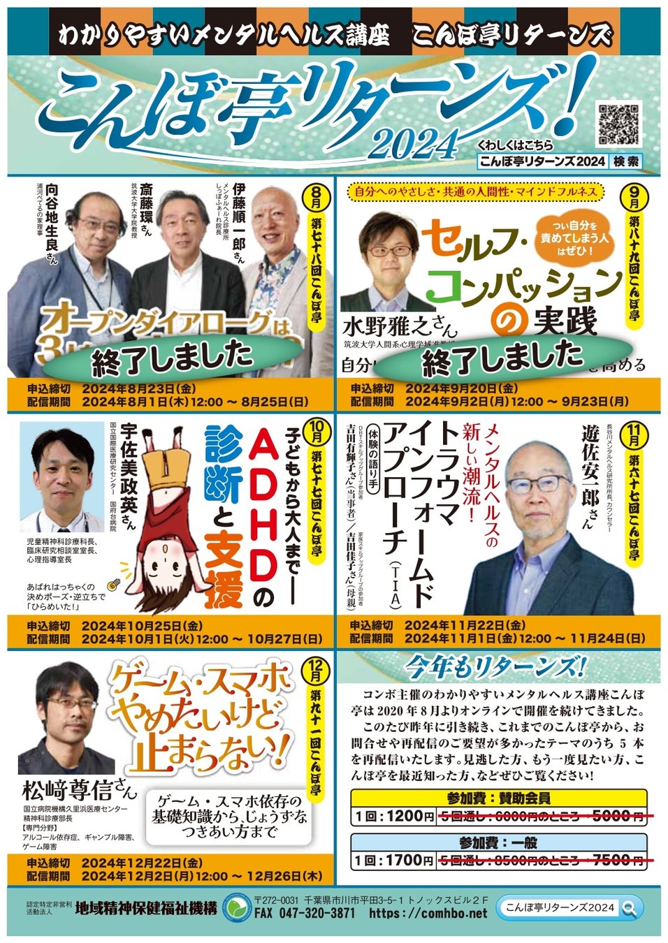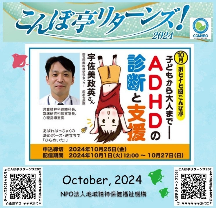 【NPO法⼈地域精神保健福祉機構・コンボ】こんぼ亭リターンズ2024(10月)「子どもから大人まで ADHDの診断と支援」:10/1より動画配信開始!(申込締切10/25)