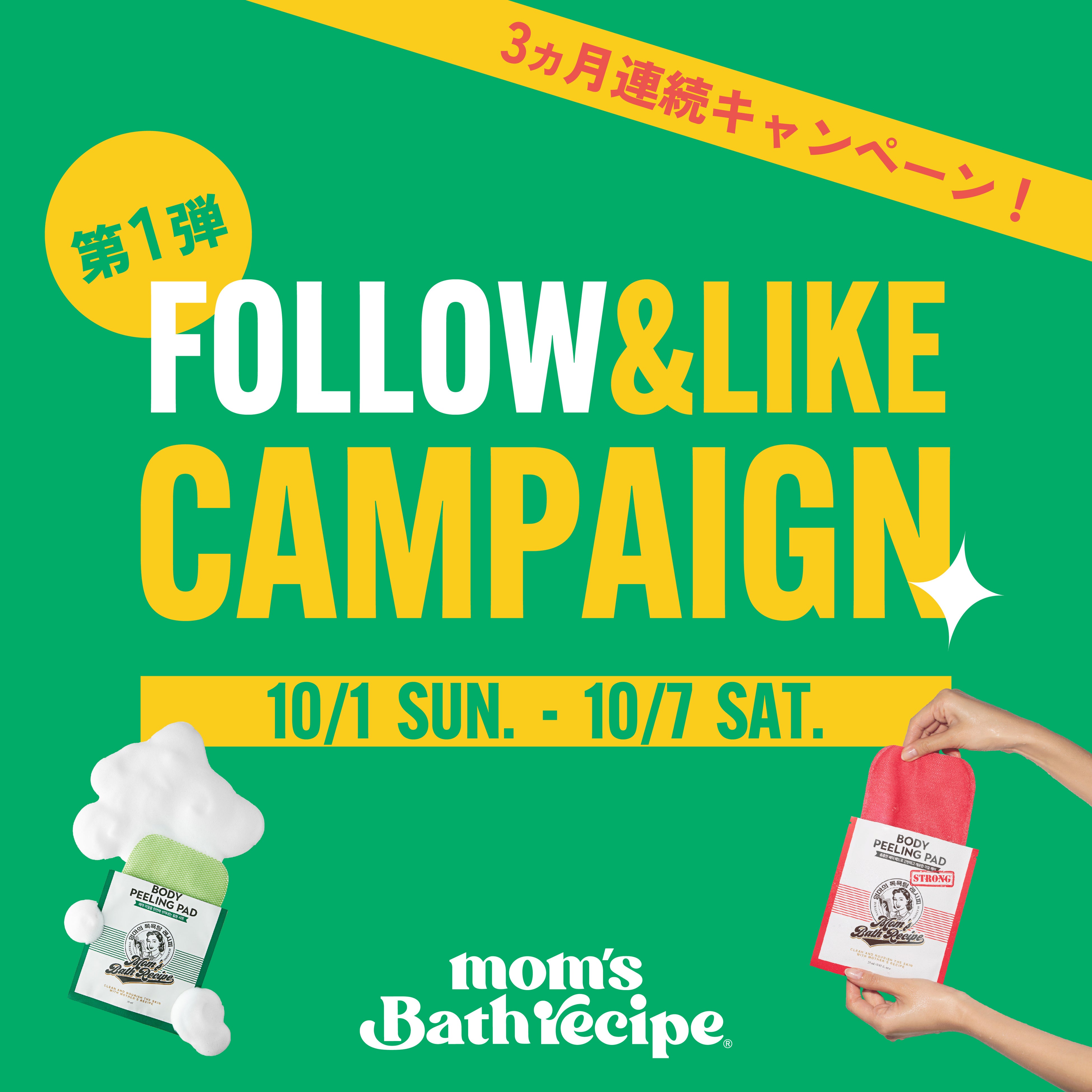 3か月連続でスタートするキャンペーンの第1弾は、Mom’s Bath Recipeインスタグラム公式アカウントのフォロー&キャンペーン投稿へのいいねで「ボディピーリングパッド オリジナル」と「ボディピーリングパッド ストロング」が各3枚ずつ当たります。