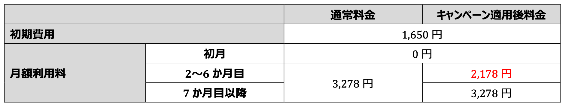 6月18日までのお申し込みで、2〜6か月目の月額基本料金から毎月1,100円割引