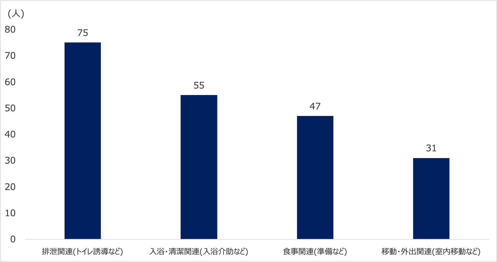認知症が進行することにより、日常生活動作(ADL)が徐々に困難になるケースも少なくありません。そこで、ADLに関する対応での困難さについて聞いてみたところ、排泄関連への対応が最も多い結果となりました。トイレの場所がわからなくなるため誘導が必要になったり、排泄を失敗してその片付けに追われたりなど、介護負担が重くなるのが要因となりそうです。その他、入浴・清潔関連(入浴や口腔ケアにサポートが必要)、食事関連(準備や咀嚼の手伝いが必要)、移動・外出関連(付き添いが必要)といった内容にも困難さを感じているという意見がありました。