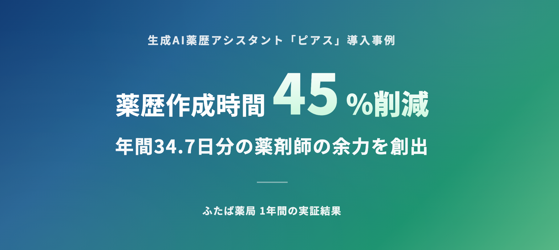 株式会社ロジロジ(代表取締役:山口洋介、以下「当社」)は、当社が提供する生成AI薬歴アシスタント「ピアス」について、電子薬歴Musubiを利用するふたば薬局(所在地:新潟県新潟市)での1年間にわたる実証運用において、薬歴作成時間の45%削減(1件あたり100秒短縮)を確認したことをお知らせします。年間約1万枚の処方箋を受け付ける同薬局では、年間277.8時間・34.7日分の薬剤師の業務余力の創出に相当します。ピアスは処方データと服薬指導の音声をAIが統合処理する独自技術(特許取得済み)により高精度な薬歴を自動生成し、電子薬歴とは独立したシステムであるため既存の電子薬歴を入れ替えることなく導入できます。令和8年度調剤報酬改定で対人業務の評価が強化されるなか、システム移行の負担なく薬剤師の時間を患者対応や在宅業務の充実をもたらす新たな選択肢として注目されます。