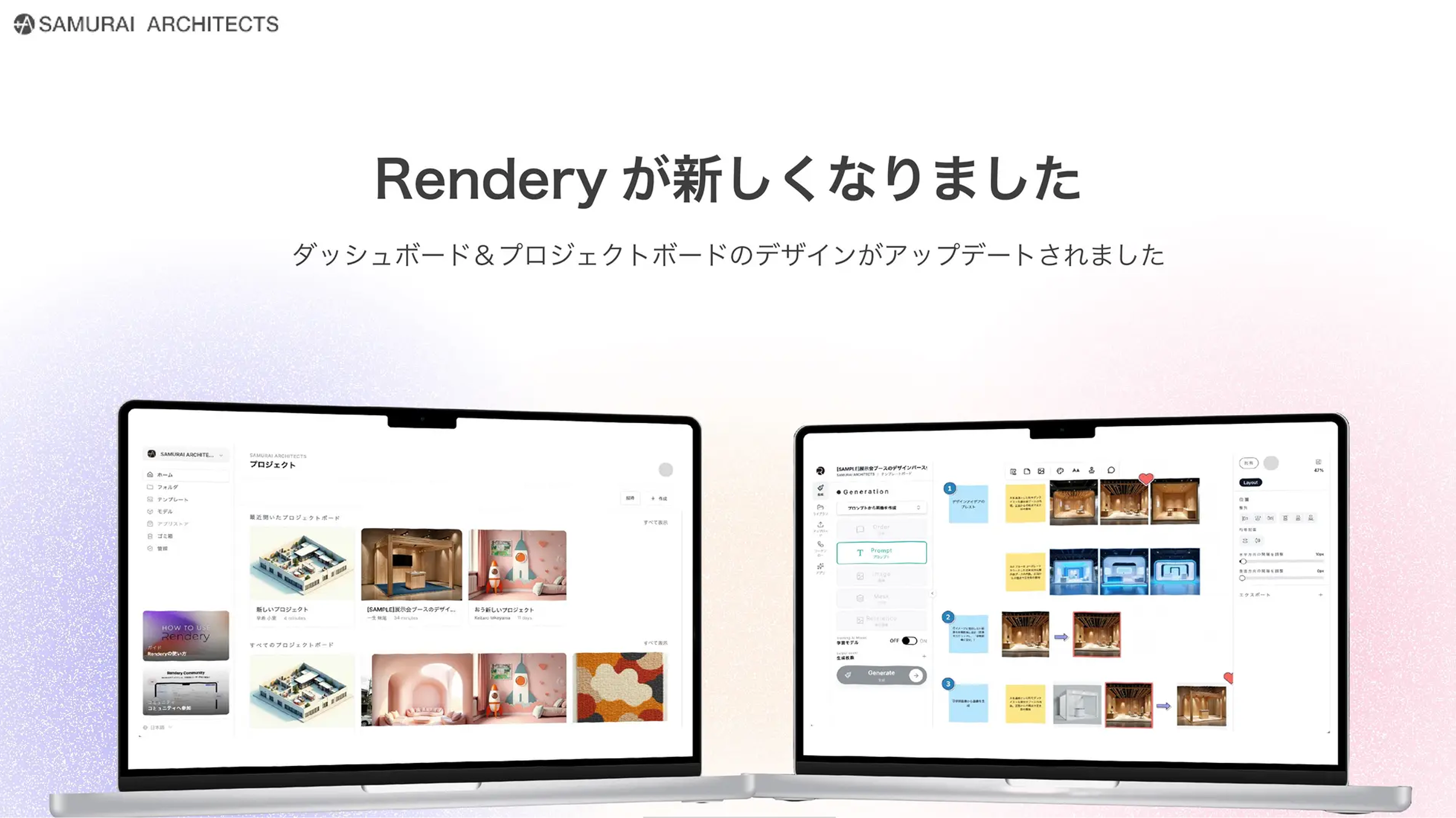 「Rendery」は、建築家やデザイナーの皆様にご愛用いただいている建築AIパースサービスです。この度、ユーザーの皆様よりいただいた多くのフィードバックを元に、ダッシュボードおよびプロジェクトボードのデザインをアップデートいたしました。より直感的で美しいUIへと進化し、日々のデザインワークを快適にサポートします。
