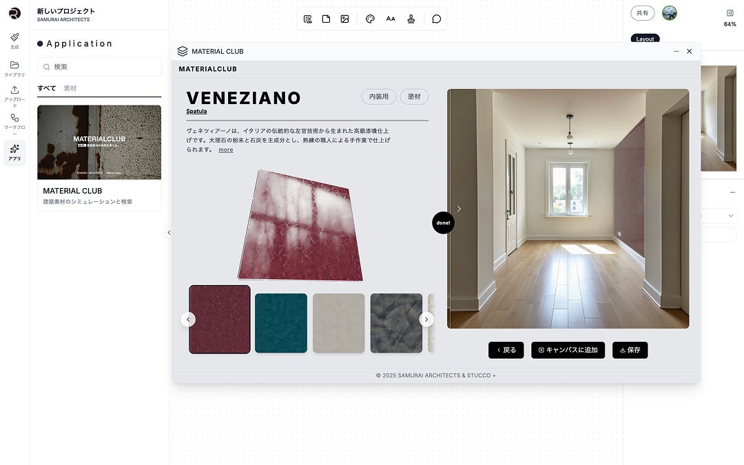 これまでの画像生成に加え、生成後のブラッシュアップや専門的なマテリアル検討をRendery内で完結させるためのアプリケーションを追加いたしました。