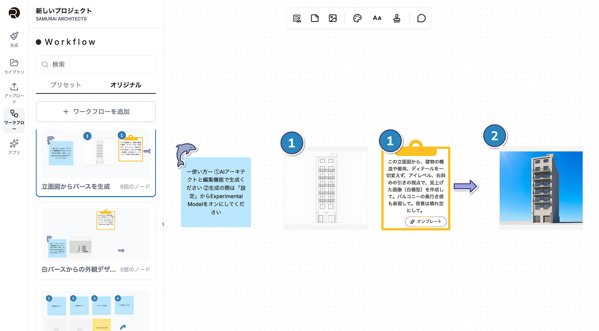 頻繁に使用するプロンプトの組み合わせ、ボードの構成、一連の作業手順を「ワークフロー」として定義・保存できるようになりました。 例えば、「立面図からパースを生成する際の手順」や「特定のテイストで出力するための設定」などをテンプレート化できます。反復的な作業を標準化・自動化することで、クリエイターが本来注力すべき「思考と設計」に集中できる環境を実現します。
