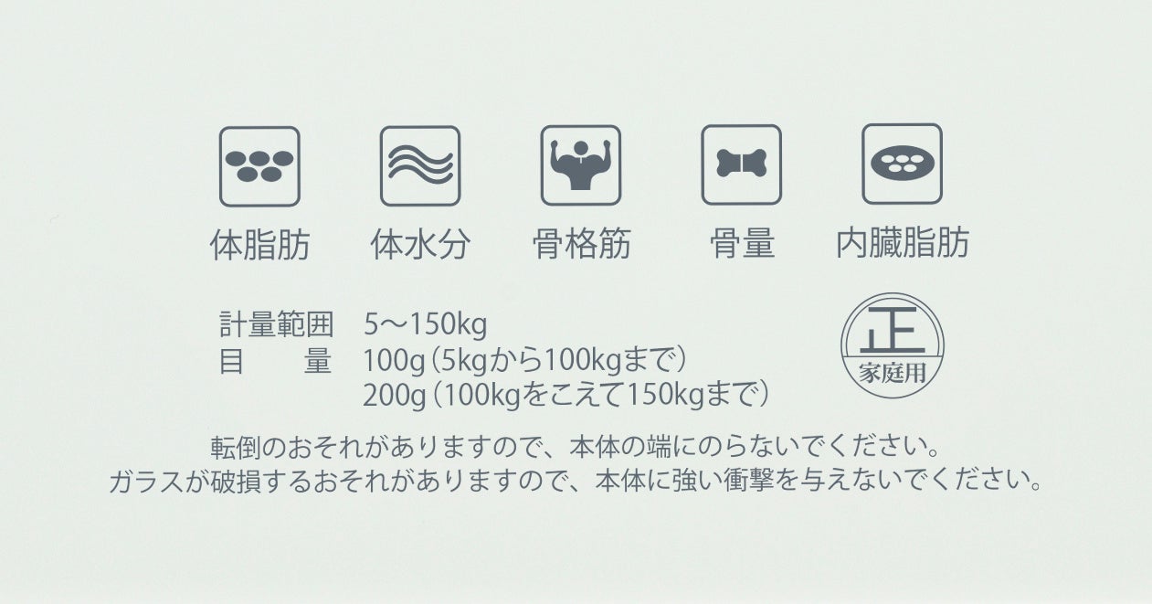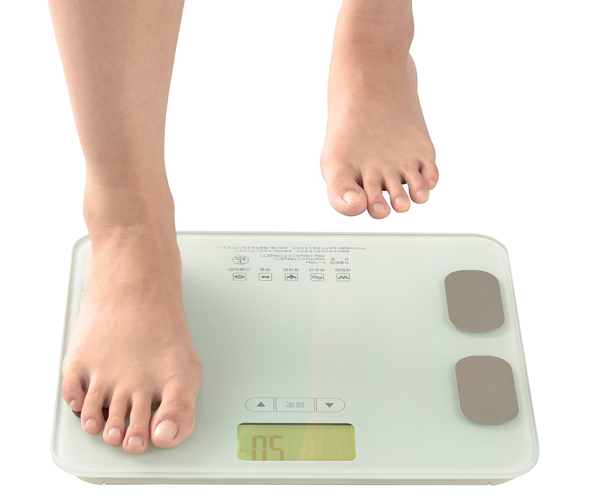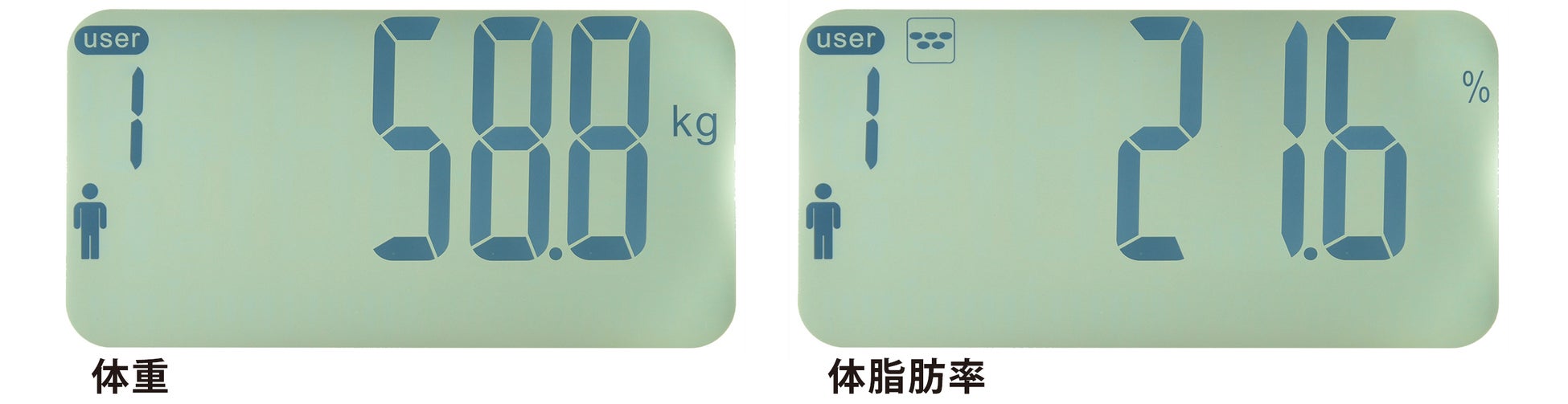 いつもの体重計と同じように乗るだけで、体重はもちろん、前回との体重差、骨量、体脂肪率、内臓脂肪レベル、体水分率、基礎代謝量、骨格筋率、BMIと、9つの項目を、自宅で簡単に計測できます。