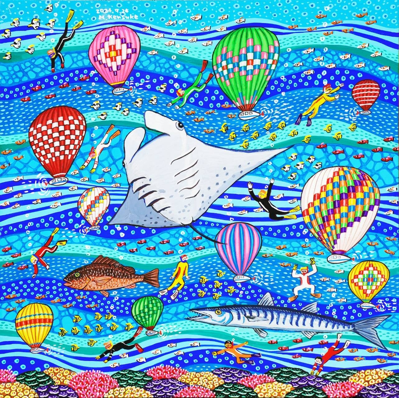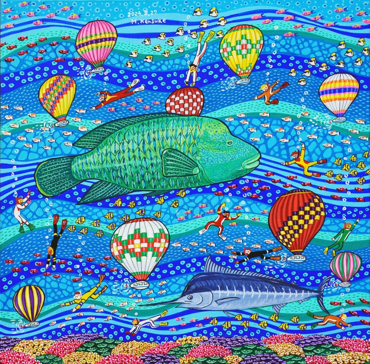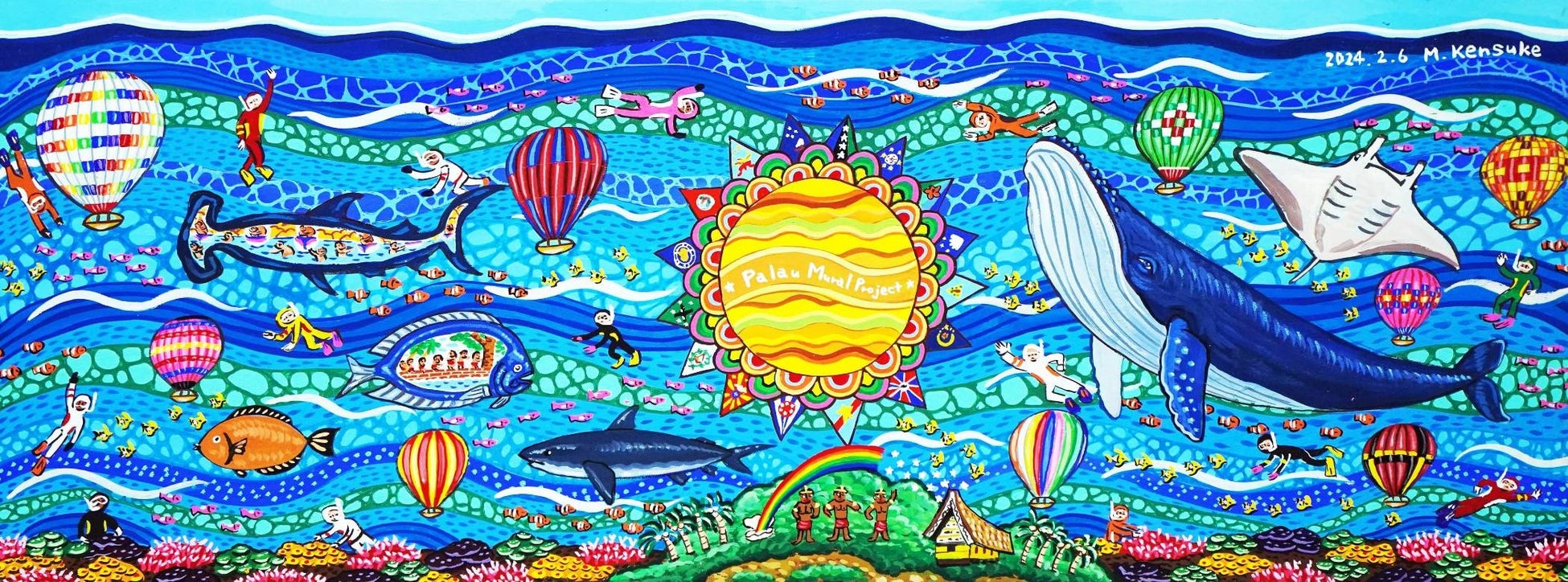 ミヤザキは”Super Happy”をテーマに、世界の様々な文化を現地の人との協働によって壁画プロジェクトとして展開してきました。本展は、パラオでの壁画ワークショップをもとに制作された絵画展となります。遠い他国・日本に広がる”青い海”たちは、鑑賞する私たちに何を抱かせるのでしょうか。現代社会において、私たち一人ひとりの”ブルー・オーシャン”とは何を指しているのでしょうか。パラオの海に棲む魚や泳ぐ人々のように、歩みを止めてたゆたい、”Super Happy”のあり方を問うてみたいと思います。